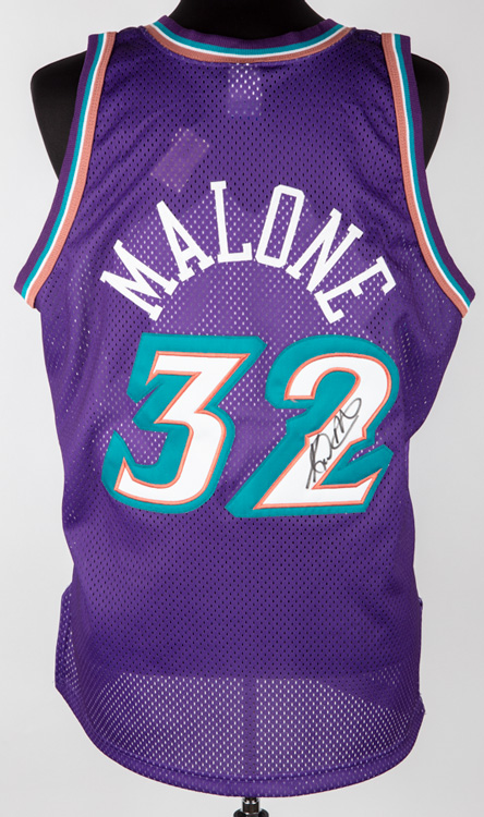 Karl Malone: Signed Utah Jazz Jersey # 32. (1963-) Karl Malone, nicknamed "The Mailman" played forward for 18 years with the Utah Jazz and remains second in all-time career points. Offered is a signed jersey (#32) of the Utah Jazz boldly signed along the line of the numeral 2 by Malone. Size 48 (Xlg) Authentic NBA Athletic Apparel by Champion Sportsware with sewn numbers and letters. Estimate Value $500 - UP