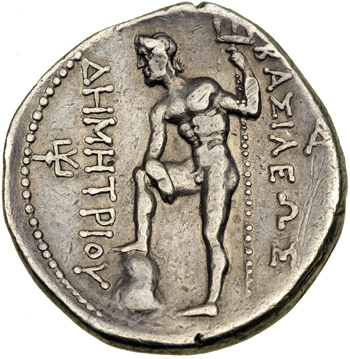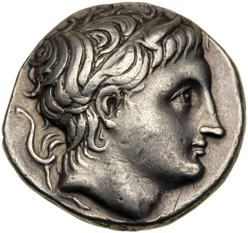 Macedonian Kingdom. Demetrios I Poliorketes, 294-288 BC. AR Tetradrachm (16.99 g), Amphipolis mint, struck c. 289-288 BC. Diademed head of Demetrios right, with bull's horn of Poseidon. Reverse: Poseidon stands left, foot on rock, holding trident; regnal inscription, monogram at left. Newell 124 var. Bold strike, with handsome portrait. Pleasing medium toning, slightly iridescent. Very Fine plus.