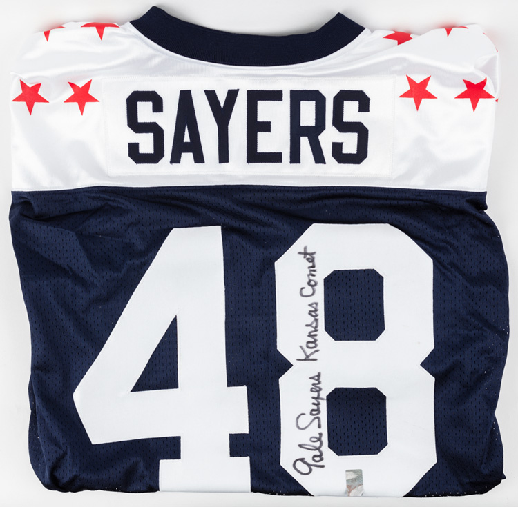 Gayle Sayers Signed Chicago Bears Football Jersey. Official (replica) Darby Sport Uniform Chicago Bears football jersey (XL/TG) with sewn numbers and letters autographed by Gale Sayers in black marker along the number on the back "Gale Sayers, Kansas Comet". Signature is bold and beautifully signed, the jersey in mint condition. Besides Sayers' formidable career, he was the youngest person inducted in the Pro Football at age 34 and most famously, his autobiography 'I Am Third" was made into the one of the most successful made for television films in history, " Brian's Song" with Sayers played by a young Billy Dee Williams. PSA/DNA certified. Estimate Value $250 - UP