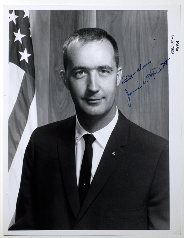 GT-4, 1965, James McDivitt "Astronaut Trainee" NASA Photograph (S-62-7806) This classic NASA 8x10" black and white glossy photo is inscribed (Best Wishes) and signed by him in blue ink (rare). Virtually pristine condition.