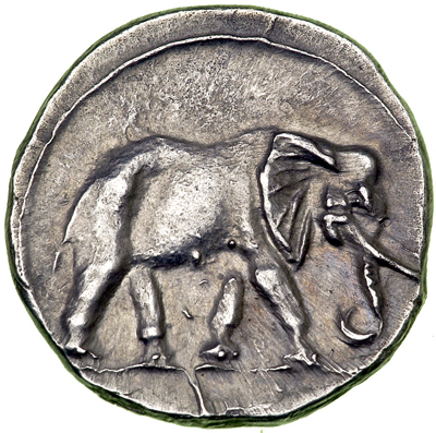 Carthage. The Barcids in Spain, c. 213-210 BC. AR Half Shekel (3.30 g), Gades mint. Outstanding specimen! Laureate male head left (Mago, youngest brother of Hannibal?). Reverse: Elephant walking right. Muller III, p. 34, 43. Excellent strike and metal for series. Lightly toned. Superb Extremely Fine. Estimated Value $1,000 - 1,500