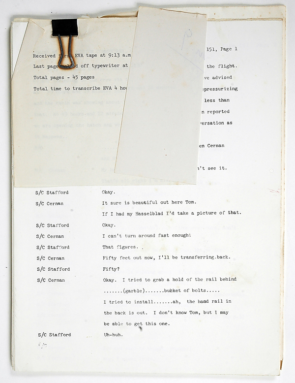 GT-9, 1966, Original Photocopies. As recovered from the consignor's files. Included is a two page copy of the flight' EVA Plan and a multipage transcription copy of their EVA tapes. Fascinating reading and important source material for the serious student of this flight.