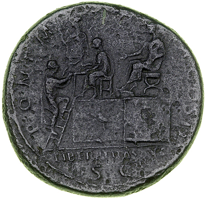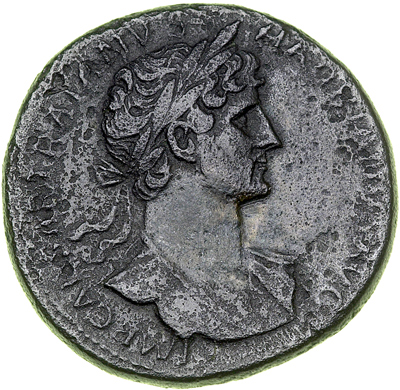 Hadrian, 117-138 AD. AE Sestertius, Rome, struck 118 AD. Laureate bust right, drapery at shoulder. Reverse: Hadrian on platform dispensing largesse, Liberalitas behind. RIC 552 var.; Sear II 3606. Surface roughness; black to dark olive patina. Fine. Estimated Value $250 - 300