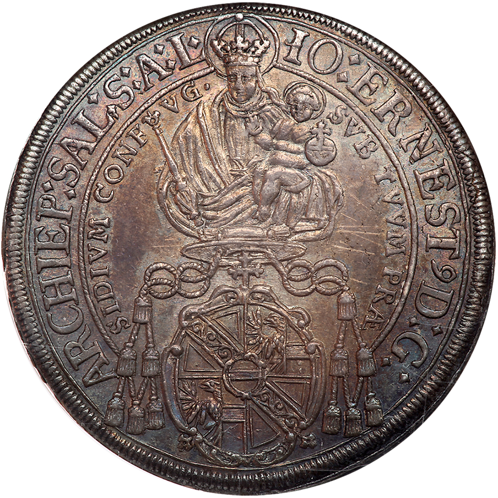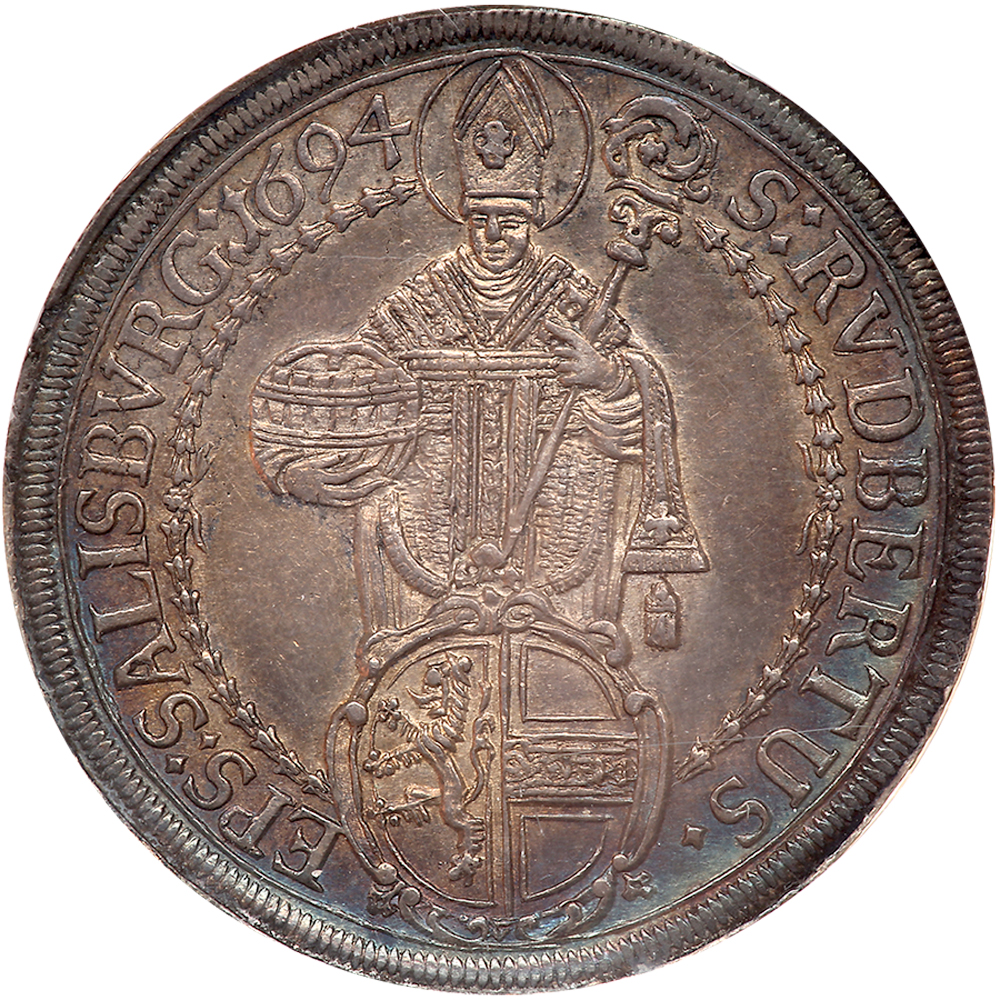 Austria: Salzburg. Taler, 1694. Dav-3510. Johann Ernst von Thun and Hohenstein, 1687-1709. Madonna and child. Reverse; Saint. Attractive toning and lustrous. NGC graded AU-58. WINGS Approved.