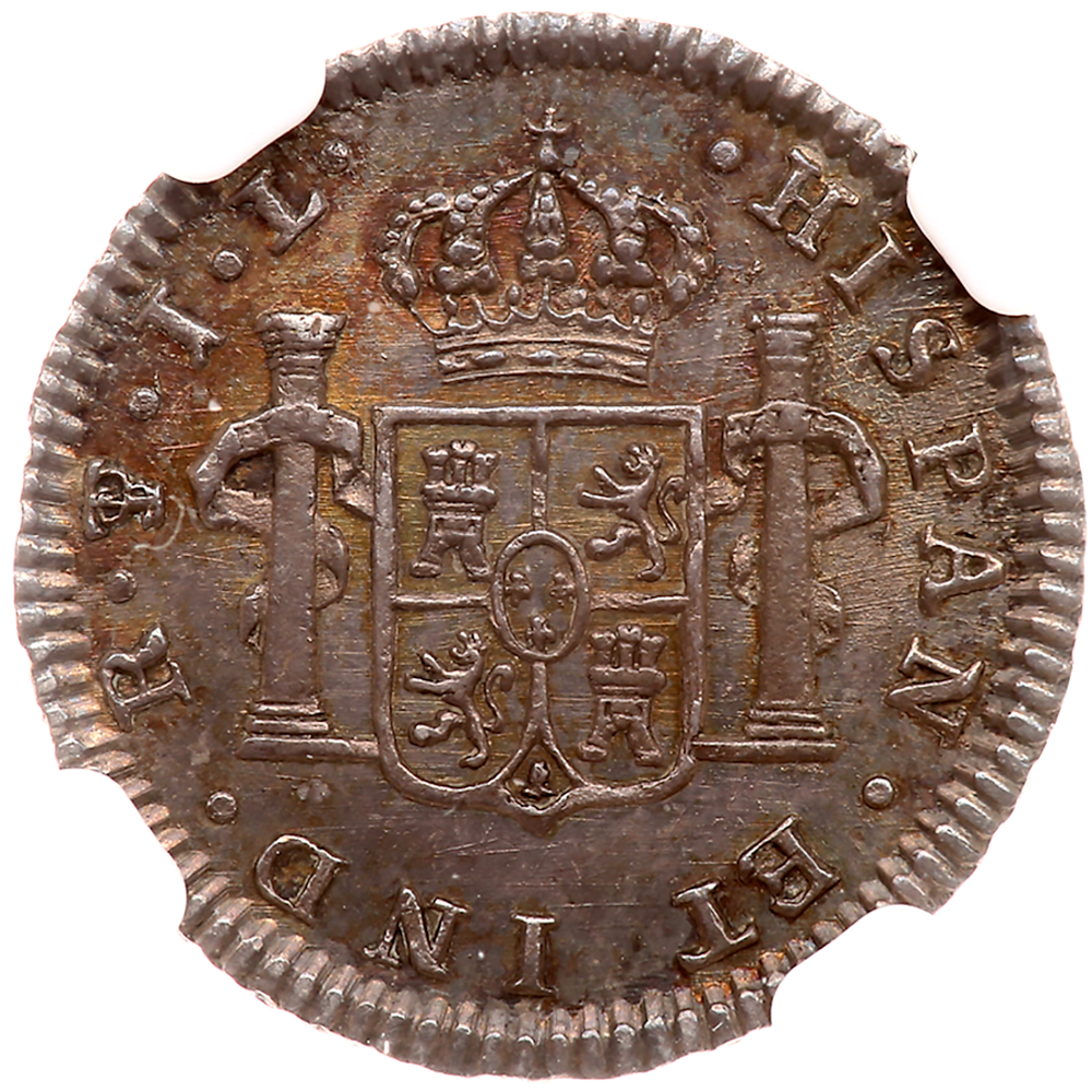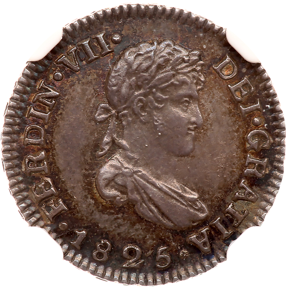 Bolivia. ½ Real, 1825-JL (Potosi). KM-90. Ferdinand VII. Laureate head right. Sharply struck with deep iridescent toning. NGC graded MS-64.