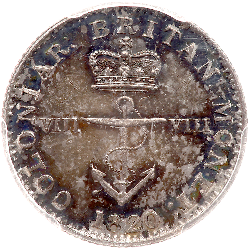 British West Indies. 1/8 Dollar, 1820. KM-2. Anchor coinage. Mottle toning. PCGS graded MS-62.