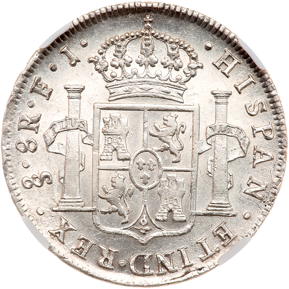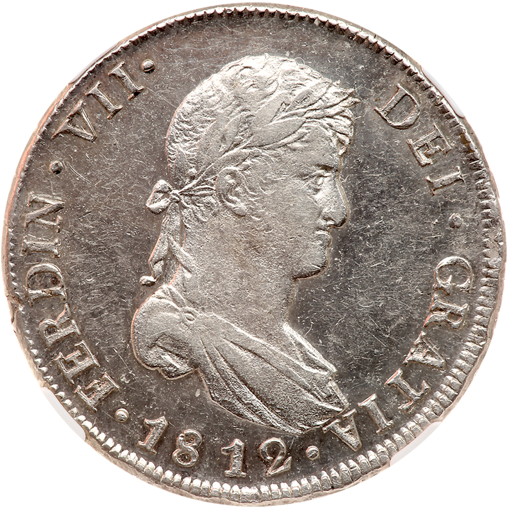 Chile. 8 Reales, 1812-So FJ. Eliz-70; KM-80. Ferdinand VII. Laureate bust right. Reflective fields with brilliant mint luster. Difficult to locate in top grades. NGC graded AU-58.