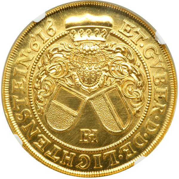 Liechtenstein. 10 Ducat Restrike, 1616 (1966). As Fr-1A. Weight 1.1095 ounce. Bust of Karl in ruff collar right. Reverse: Crowned arms. NGC graded MS-68.