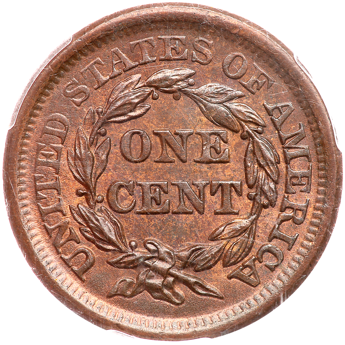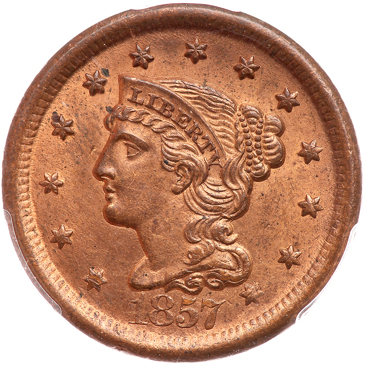 1857 N-1 R1 Large Date PCGS graded MS64 Red & Brown, CAC Approved. Lustrous bright mint red fading to light bluish steel brown with 80% of the bright original red showing on the obverse while about 20% of the reverse shows mellowed mint color. An impressive cent that offers great eye appeal. The notable marks, and they are not at all distracting, are a dull nick on the truncation over the 8, a spot of darker toning nestled between the upper left points of star 4, and a speck of carbon over star 5. M-LDS, die state b. The top of the stray 1 hidden in the dentils under the right side the normal 1 is weak and the die lines over NI in UNITED are gone. Our grade is MS63, tied for CC#10 in the Grellman census. The attribution and Oakes provenance are noted on the PCGS label. PCGS population 6; 3 finer, 2 in 65, 1 in 65+ for the variety at PCGS. Estimated Value $1,500-UP