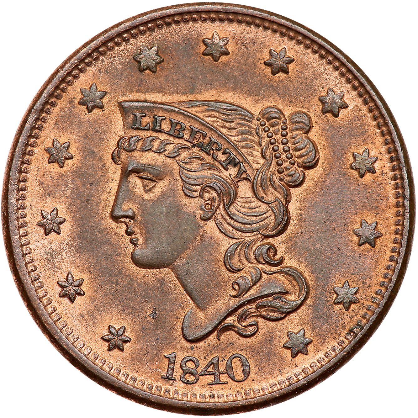 1840 N-6 R1 Large Date with 840 Repunched PCGS graded MS64 Red & Brown. Frosty bluish steel brown with nearly half the original mint red remaining on the obverse and a third of the mint color showing on the reverse. Nearly flawless but here are traces of light carbon at ERT in LIBERTY and two small carbon spots at the I in AMERICA. Otherwise this cent is close to gem and the considerable amount of original mint color is a big plus. MDS, die state b. The repunching on the 40 is still clear but the repunching on the 8 and the arc line at the dentil tips over RIC are gone. Our grade is MS63, tied for CC#7 for the die variety in the Grellman census. The attribution and Fricke provenance are noted n the PCGS label. PCGS population 2; tied for finest of the variety graded at both services. Estimate Value $1,500 - UP