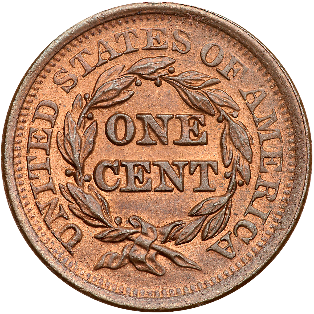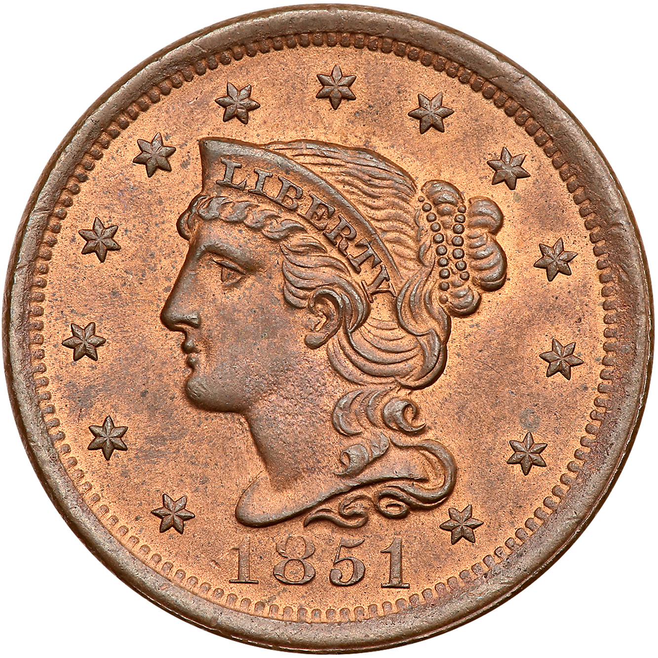 1851 N-2 R1 PCGS graded MS65+ Brown, CAC Approved. Lustrous mint red fading to steel brown on the highpoints, about two-thirds of the mint color remaining. Can't see why this one didn't get an "RB" designation from PCGS. No spots or notable signs of contact. LDS, die state b. The die line at the throat and the ones at the inner curl are gone. The dies are worn and the top of the 8 is weak. A very attractive example, close to gem quality. Our grade is MS64, tied for CC#7 in the Grellman census. The attribution and Fricke provenance are noted on the PCGS label. PCGS population 1; 1 finer in 66 for the variety. Estimate Value $1,000 - UP