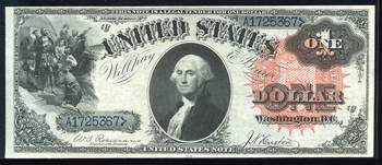 1880, $1 United States Note. . Fr-31. . KL-18. PCGS graded Choice About New 58. This Rosecrans/Houston combination with the Large Red seal and serial numbers in Blue is one of the scarcer Frreidberg numbers in the series.