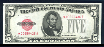 Fr-1525*. 1928, $5 Legal Tender Note. . Fr-1525*. . KL-1639*. PCGS Very Fine 35. Bright and well centered, an attractive looking and very scarce Red Seal star note.