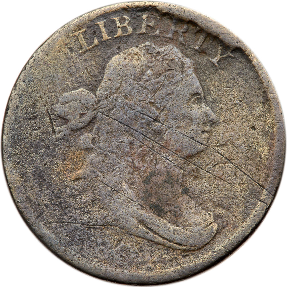 1804 C-2 R6 AG3. Slightly sharper but covered with very fine roughness. No verdigris and the only notable marks are a half dozen fine scratches on the obverse. Slightly glossy mix of medium brown, chocolate, and olive brown. Probably lightly cleaned and retoned. The left half of both sides is weakly struck, as always on the variety but especially pronounced in the late die state. LDS, Manley state 3.0, with a strong cud break at ERTY. The reverse is rotated about 30 degrees clockwise. The date is weak but readable and most of the legends are complete. The Missouri Cabinet example of the variety with the cud break was a cleaned and damaged net G4+ that brought $12,075 (our sale 1/24/2014:61), and the corroded net G6 example in our Davy Collection Sale (9/4/2011:210) brought $32,200. Not a die state suited for the high-end registry collector. Value $4,000 - UP