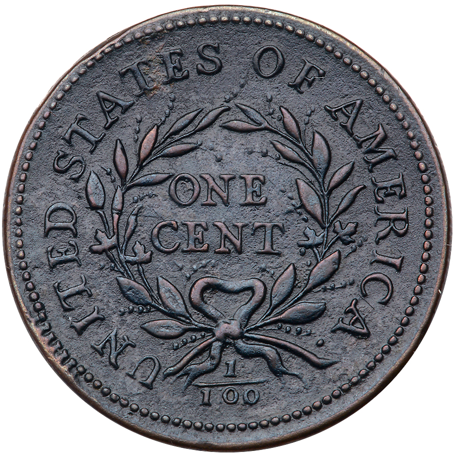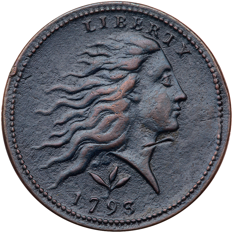 1793 S-10 R4 Wreath Cent with Vine & Bars Edge F12. Sharpness VF35 but the toning is dark olive and chocolate brown, and extremely fine granularity covers all but the highpoints, which are smooth. No verdigris but there is an old scratch from the field under the chin to the throat. MDS, Breen state I late, with a narrow rim cud over NITE and obvious die failure in the border beads before the face. The date and legends are complete and bold. Removed from an NGC slab graded XF Details Damaged (NGC label #3216484-009 included and it shows the attribution). Estimate Value $3,000 - UP
