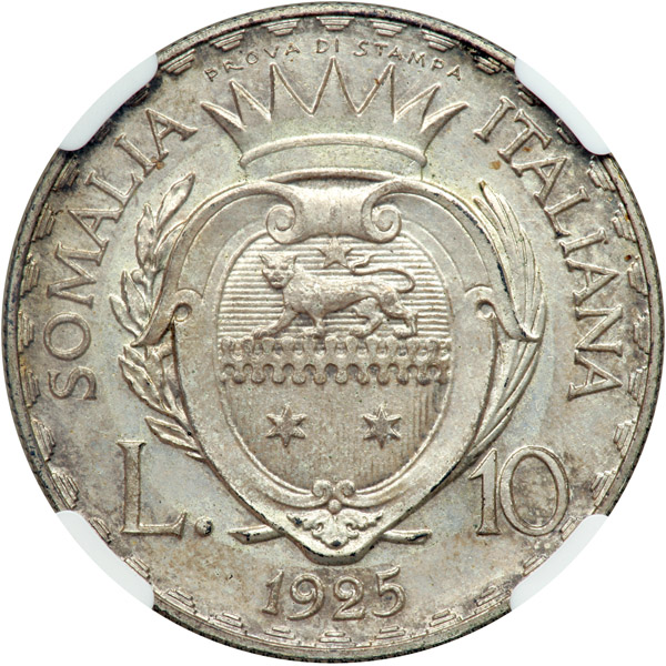 Italian Colonies - Italian Somaliland. Prova 10 Lire, 1925-R. Pagani-403; KM-Pr14. Silver. Prova di stampa. Reeded edge. Vittorio Emanuele III. NGC graded MS-63.