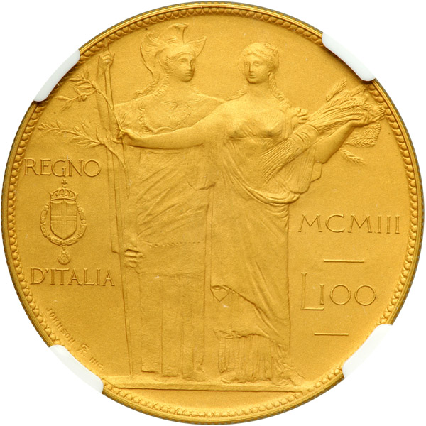 Italy. Pattern Gilt Bronze 100 Lire, 1903-R. KM-PN6; Pagani-139. By Johnson Inc. Vittorio Emanuele III. Head right. NGC graded Proof 65