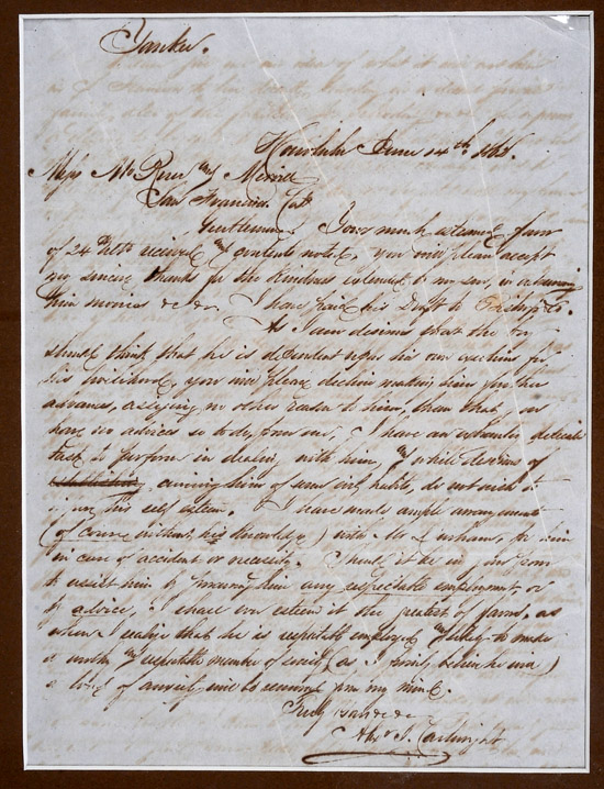 Alexander Cartwright - New York Knickerbocker Base Ball Club. Autograph Letter Signed "Alx. C. Cartwright", 8 x 8 in., Honolulu, H.I. June 14 1862, regarding a financial matter. Matted and framed to an overall size of 11½ x 14 in. Cartwright (1820-1897) was a founder of the amateur New York Knickerbocker Base Ball Club and chaired the commission that established baseball's official rules. These included the requirement of tagging out a base runner rather than hitting him with a thrown ball and fixing the distance between bases at 90 ft (27.4 m). The first game under the newly codified rules was apparently played in Hoboken, N.J., in 1846.