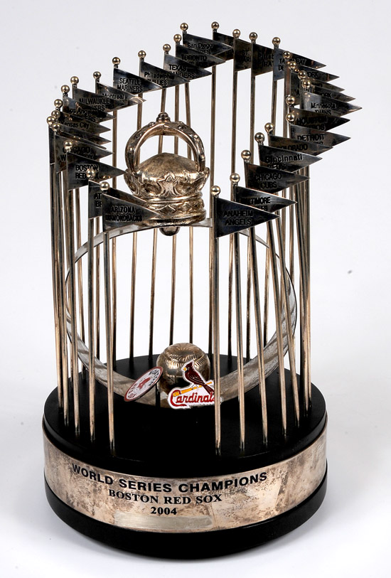 Player's Replica 2004 Boston Red Sox World Series Trophy. Engraved "World Series Champions / Boston Red Sox / 2004." The awardee's name has been removed from below "2004." Approximately 11¾ inches in height, including base, which is 7¼ inches in diameter. The trophy contains flags representing each team in the American and National Leagues. Appears to be silver-plated, except for the black base and the two press pins which are set on the base of the trophy for the two teams participating in the 2004 World Series: the Boston Red Sox and the St. Louis Cardinals. A huge ring set on the base holds a baseball in the bottom and a crown on top. Some tarnishing to band around the base and to the ring, otherwise in fine condition. Team players and employees were authorized to buy replicas of the larger team trophy.