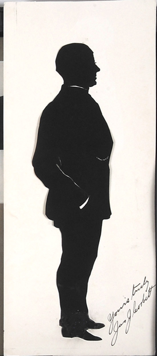 Corbett, James J. & Gene Tunney. Full-length silhouette signed, "Gene Tunney," 10¾ in. on 11½ x 5½ backing. Tunney was heavyweight champion 1926-28. Part of his last name is written beneath his leg. Matted and framed with a 5 x 3 in. photo of Jack Dempsey and Tunney signed "From Jack and Gene" by one of them in the lower border; overall size is17¾ x 13¾ in. With a separate, full-length silhouette signed, "Yours truly Jas J Corbett," 10½ in. image on 12¾ x 5½ in. backing. "Gentleman Jim" was the 1892-97 heavyweight champion. Silhouette cut by artist Beatrix Sherman around 1916 in Atlantic City. Some whitening around ankles and shoes.