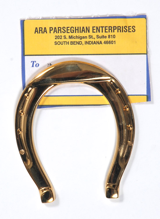 Parseghian, Ara. A gold-color horseshoe and a handwritten letter, circa 2001, on blue, personal memo paper from the legendary coach to Danny Leeds, a young man suffering from a brain tumor (he died in 2002). The note says, "Dear Danny-May the luck of the Irish be with you.--Rub the "Horseshoe" for good luck! Ara Parseghian." Paper has some wrinkling; the horseshoe is in its original box.