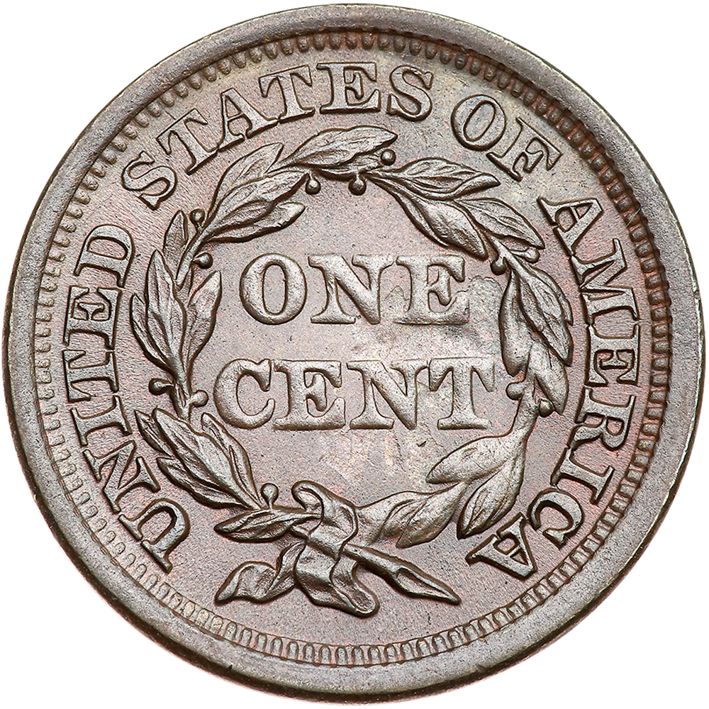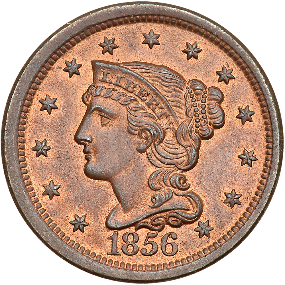 1856 N-1 R1 Italic 5 PCGS graded MS64 Red & Brown, CAC Approved. The obverse is frosty mint red mellowing to steel brown with at least 40% of the mint color remaining. The reverse is lustrous medium steel brown and light olive with traces of faded mint red showing. No spots, stains, or contact marks. The only defects are a few very shallow low spots around ONE CENT. MDS, die state a late. The die lines over UN are dull and faint but still visible. Our grade is MS62+, tied for CC#16 in the Grellman census. The attribution and Tucker provenance are noted on the PCGS label. PCGS population 2; 2 finer, 1 in 64+, 1 in 65 for the variety. Estimate Value $550 - UP