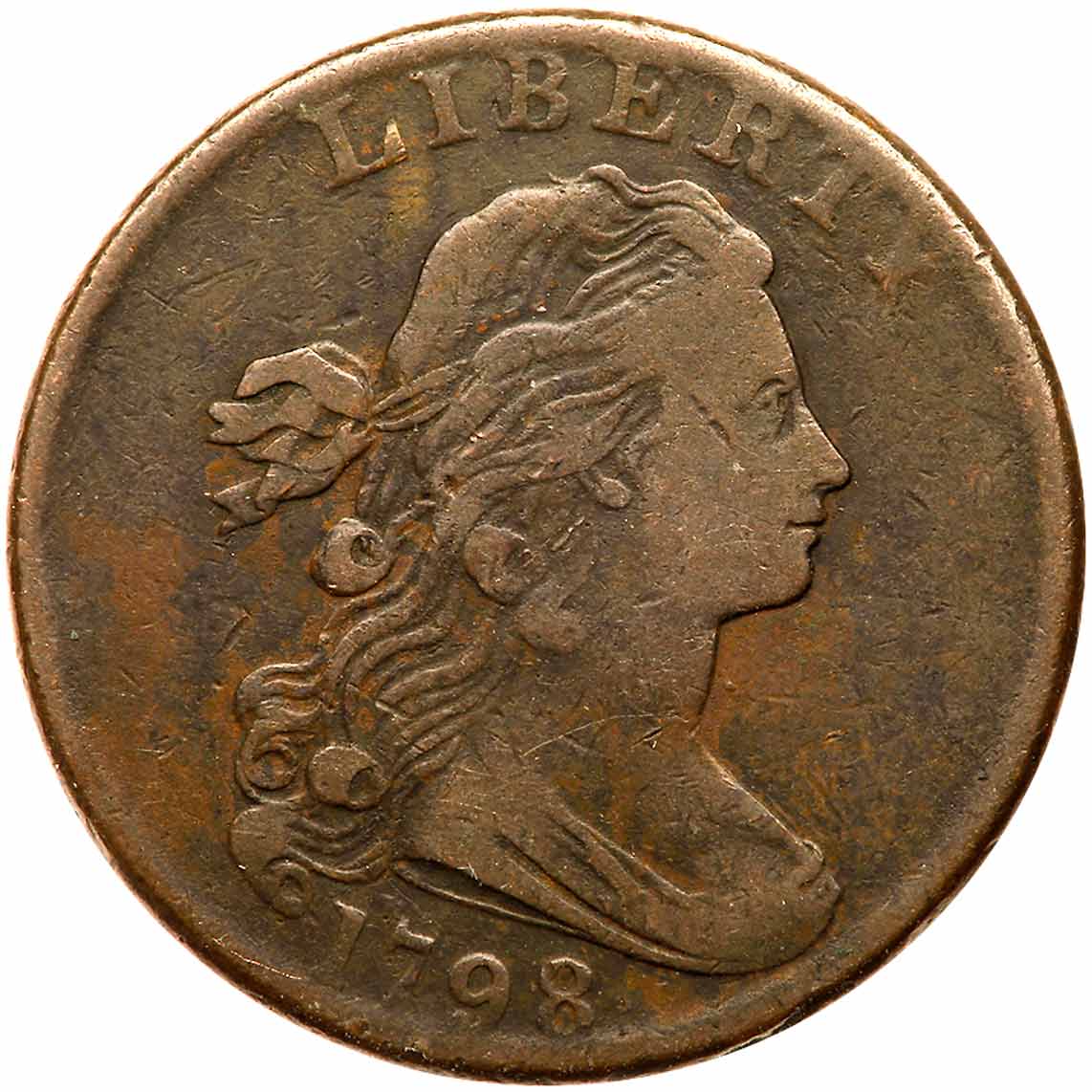 1798 S-184 R1 Small 8, Style II Hair F12+. Mostly glossy olive brown and steel with a couple puffs lighter brown in the obverse fields and lighter steel brown toning on the highpoints. No corrosion or notable marks. MDS with the usual die clashmarks on the reverse. Estimated Value $200 - UP