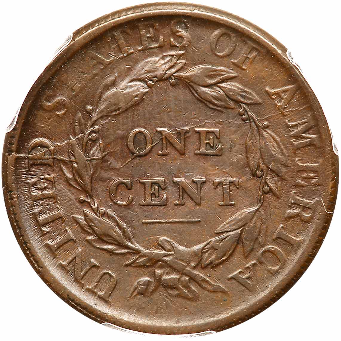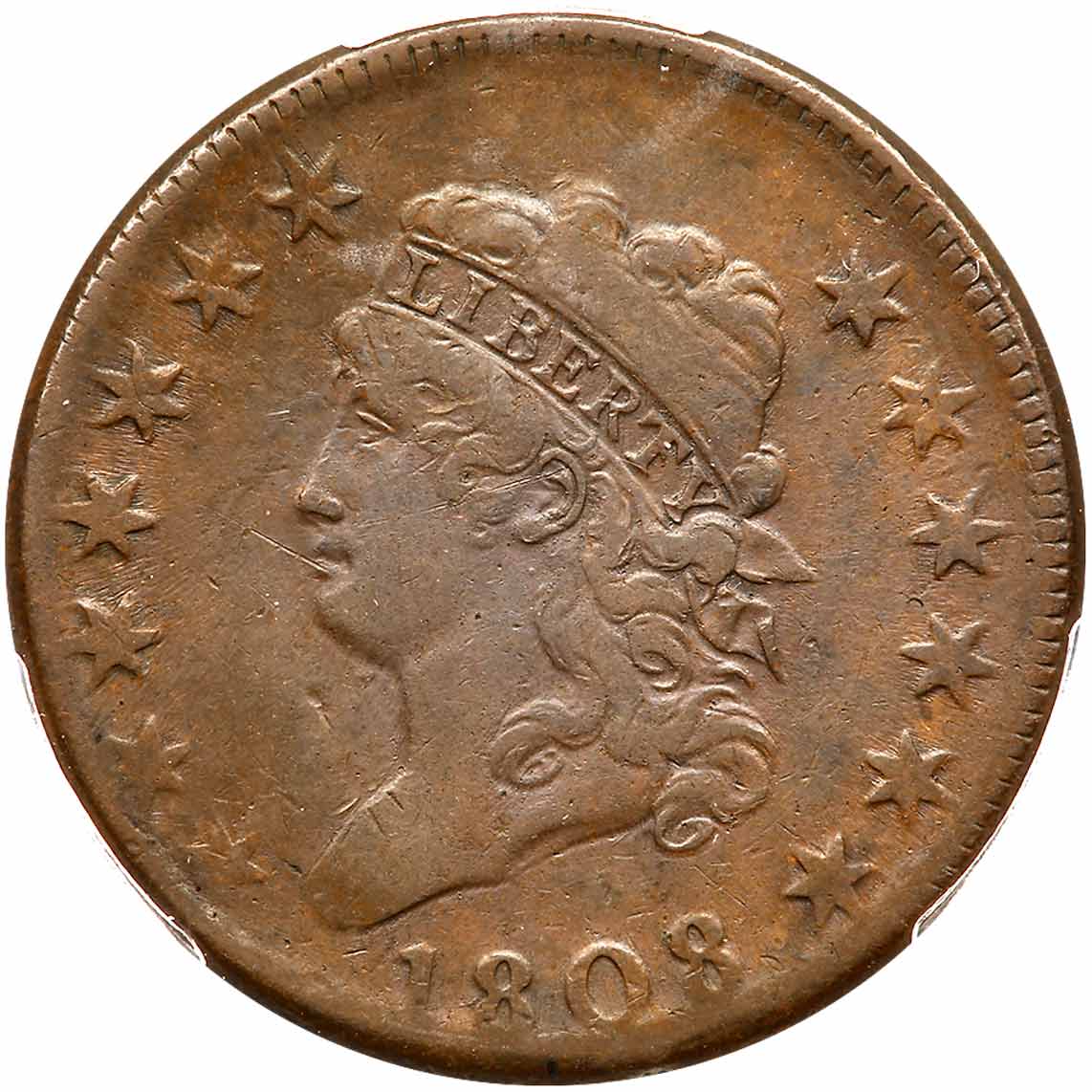 1808 S-277 R2 PCGS graded VF30. Frosty steel brown and olive with lighter steel brown toning in some of the protected areas. Flowline luster shows in protected areas on the reverse. The surfaces are a bit dull from a layer of natural oxidation, and this cent looks like it has never been brushed. No roughness or verdigris and the only mark is a small nick or planchet chip in the field below the chin. LDS, the latest seen, Breen state IX. The die cracks on the reverse are strong, a small internal cud break shows inside the top of the D in UNITED, and there are rim cuds over that N and ED. Our grade is VF25. Estimated Value $500 - UP
