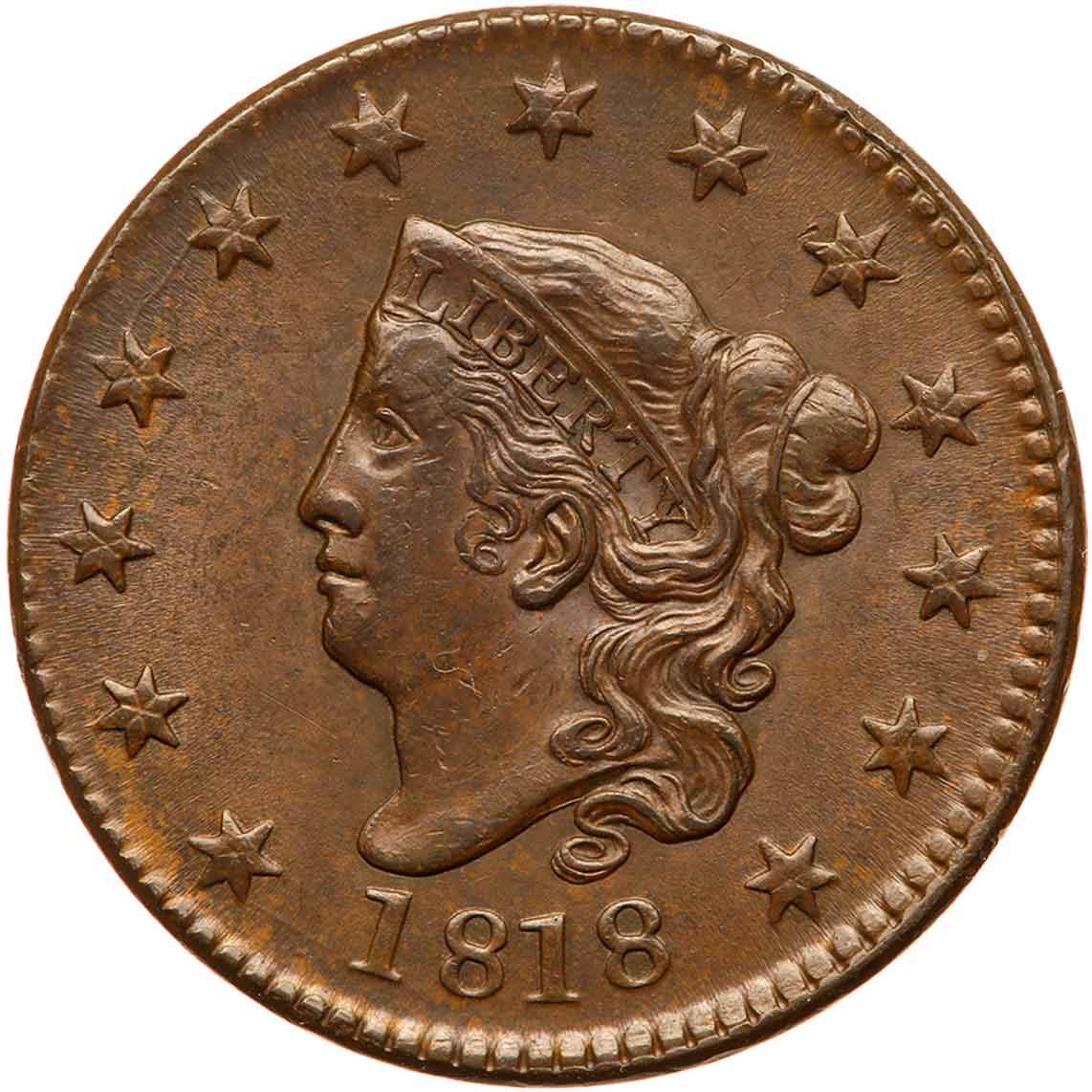 1818 N-1 R2 AU50+. Lustrous steel brown and chocolate with peeps of golden tan in protected areas on the reverse. A beautiful cent, satiny and virtually flawless with mint state eye appeal in spite of touch of rub on the highest points of the devices. MDS showing fine radial die flowlines in the fields and tiny rim crumbles near star 4. The obverse is slightly misaligned to K-10 while the reverse is properly aligned on the planchet. Near the lower end of the condition census for this variety. Removed from an NGC slab graded MS62BN (NGC label #1667675-015 included). Estimated Value $700 - UP