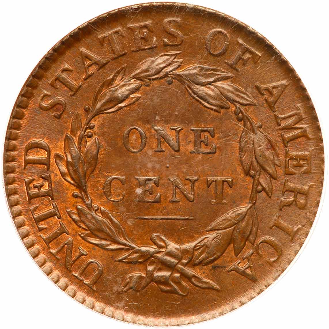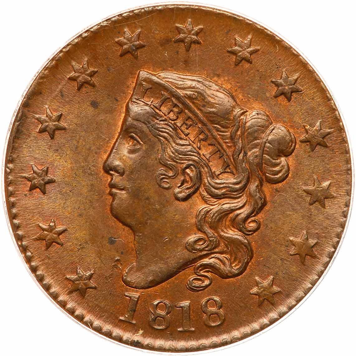 1818 N-1 R2 PCGS graded MS64 Brown. Lustrous light bluish steel brown and tan with 10% of the mint color remaining, mostly on the reverse. There are some light nicks on the top of the first 8 in the date, a few more off the bust tip, and a spot of darker toning in the field under the chin. LDS. The dentils are fading but remain nearly complete, and a narrow rim cud shows from star 3 up to well past star 4. Die chatter doubling shows on the right edge of the portrait, including the ear and LIBERTY. An attractive example of a variety that’s difficult to find in mint state. Graded MS60 and tied for CC#3 honors in the Noyes census, his photo #60369. Our grade is MS60+. The attribution and Dan Holmes Collection provenance are noted on the PCGS label. Pop 4; 3 finer for the variety in MSBN at PCGS, 2 in 65, 1 in 66. Estimated Value $2,000 - UP Ex Henry T. Hettger, 2007 EAC Sale, McCawley & Grellman Auctions 4/28/2007:378-Daniel W. Holmes, Jr., McCawley & Grellman Auctions/Goldbergs 5/30/2010:73 ($2530, lot ticket included).