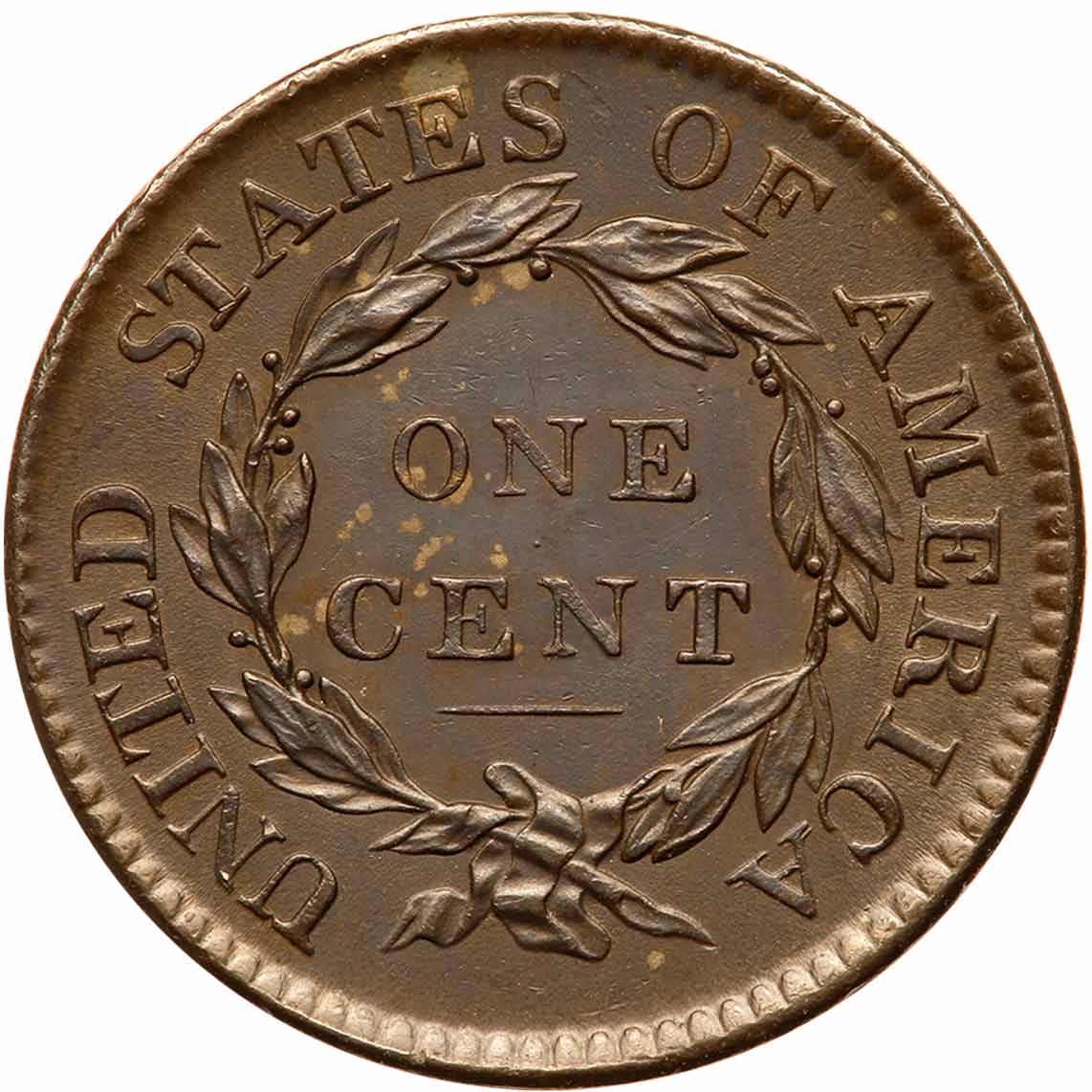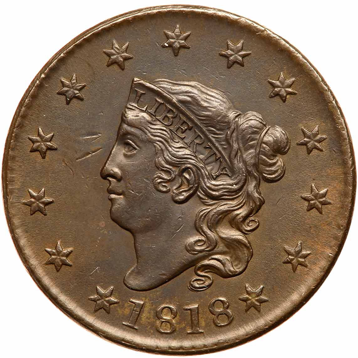 1818 N-3 R3 AU50. Frosty dark steel gray with a few tiny specks of lighter olive toning on the reverse, the largest of these at the top of the E in STATES. The only contact marks are two diagonal nicks in the field before the face. The surfaces are satiny with just a hint of rub on the highest points of the devices. LDS. The spike up from the coronet tip is gone and the reverse is rotated 30 degrees CCW. Noyes graded AU55 net AU50 and tied for CC#7, his photo #25433. Removed from an NGC slab graded MS62BN (NGC label #502693-001 included, and it shows the attribution and Rasmussen provenance). Estimated Value $1,250 - UP