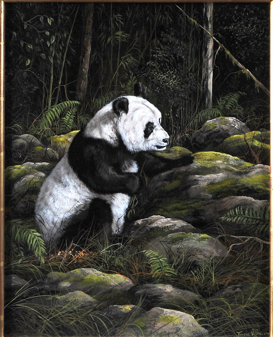 Swanson, Trevor V. Panda Bear. Oil on canvas. 19½ x 15¼" (sight). Framed to 28 x 24". Signed at lower right. A delightful painting of a panda, readily recognizable from its distinctive black and white coloring, holding a bamboo shoot.
