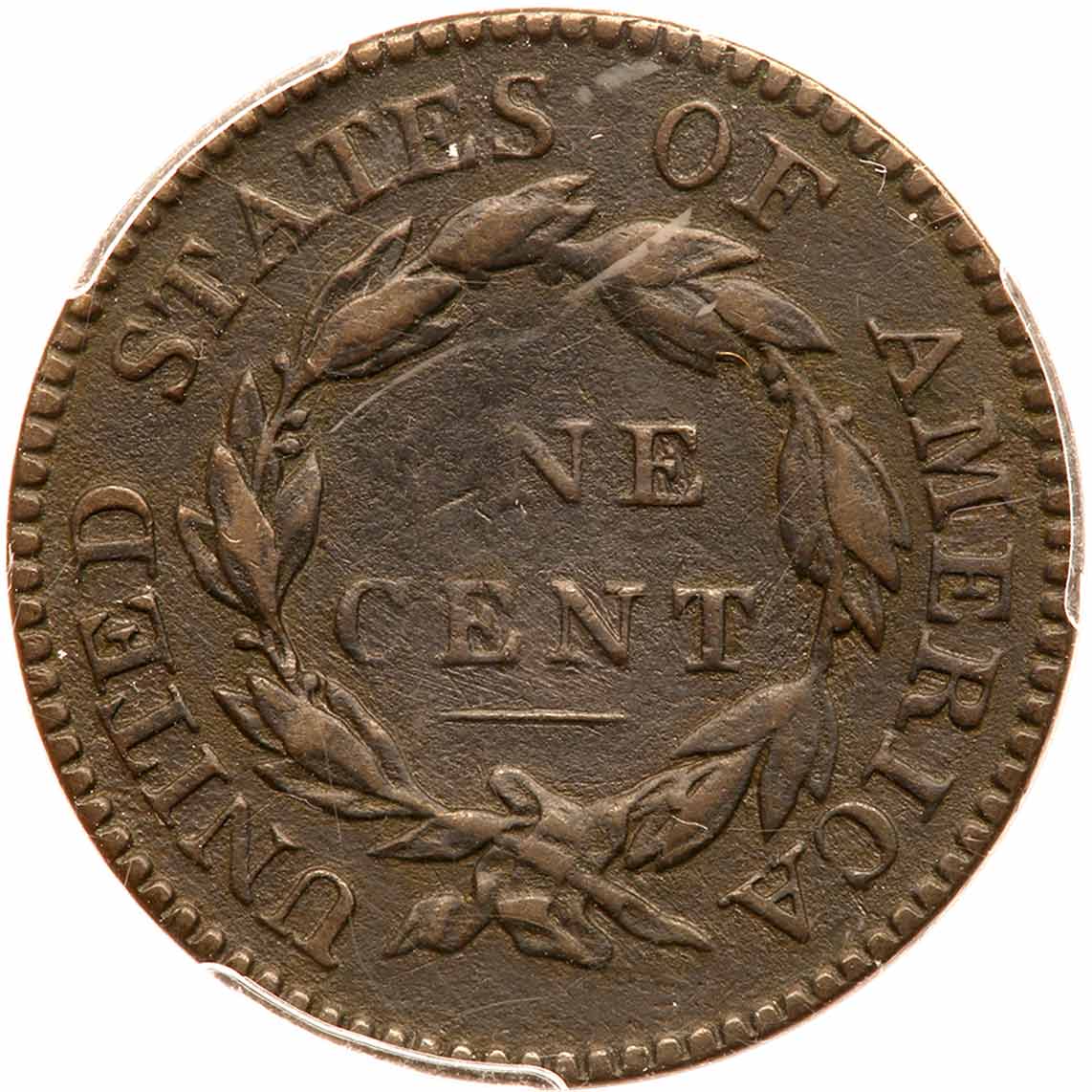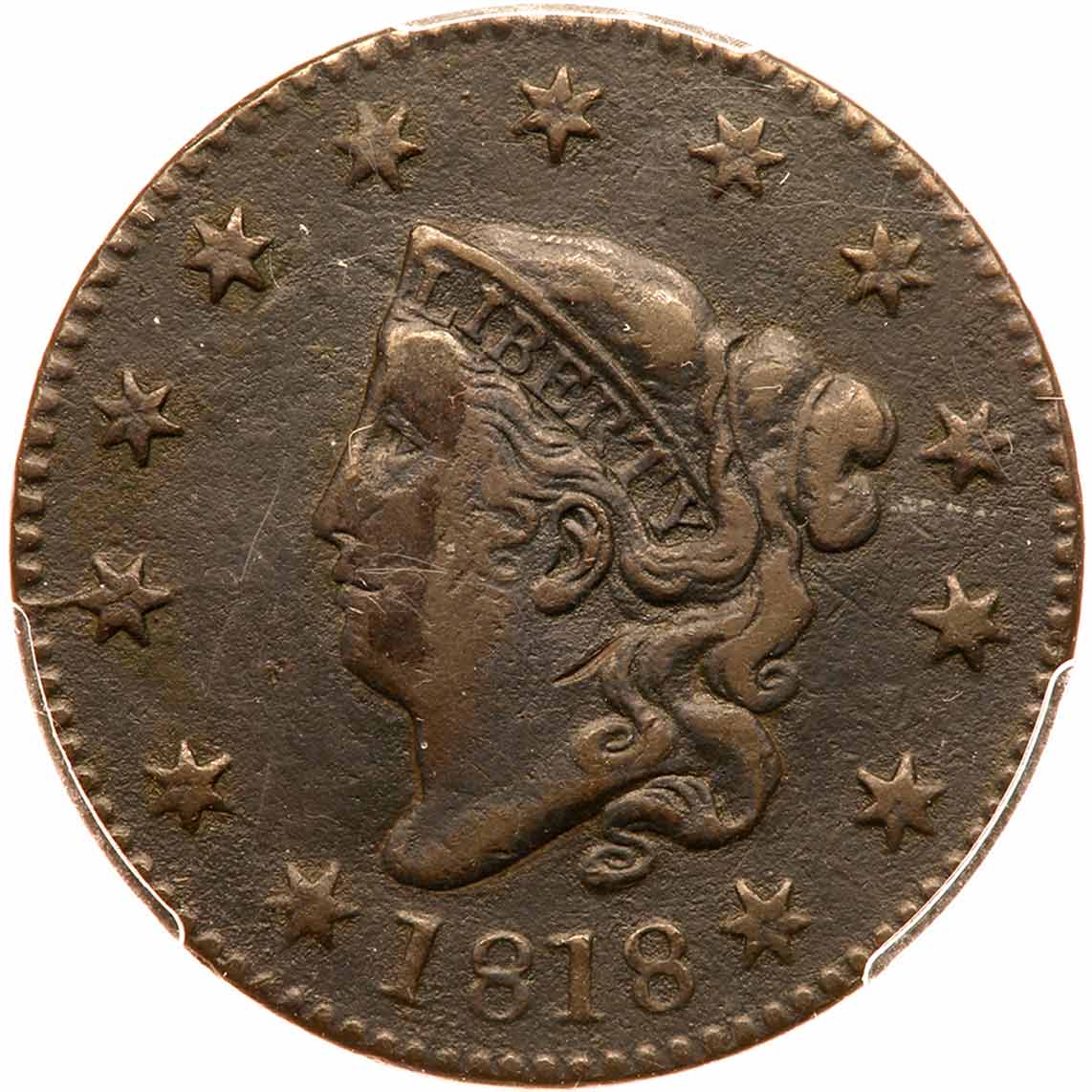 1818 N-4 R4+ PCGS VF Details Environmental Damage. Sharpness VF25 but covered with fine granularity on all but the highpoints, which are smooth. No verdigris and the only mark is a diagonal nick on the neck near the hair. Dark olive brown and steel with lighter steel brown toning on the highpoints. A swipe of darker chocolate brown toning down the face can help identify this piece. MDS with a strong die crack from the rim to star 3 but the crack is faint where it extends from the star into the field towards the mouth. The O in ONE is faint which is typical for this variety. Graded VF25 net F15 by Del Bland. Our grade is net F12. The attribution and Wright-Frankenfield-Ellsworth provenance are noted on the PCGS label. Estimated Value $750 - UP