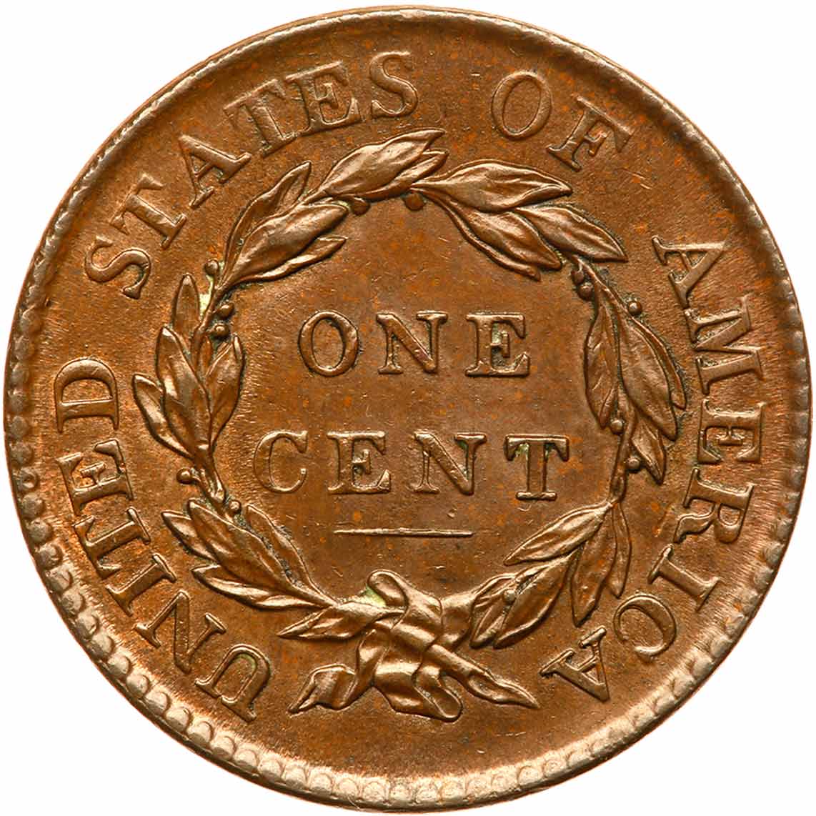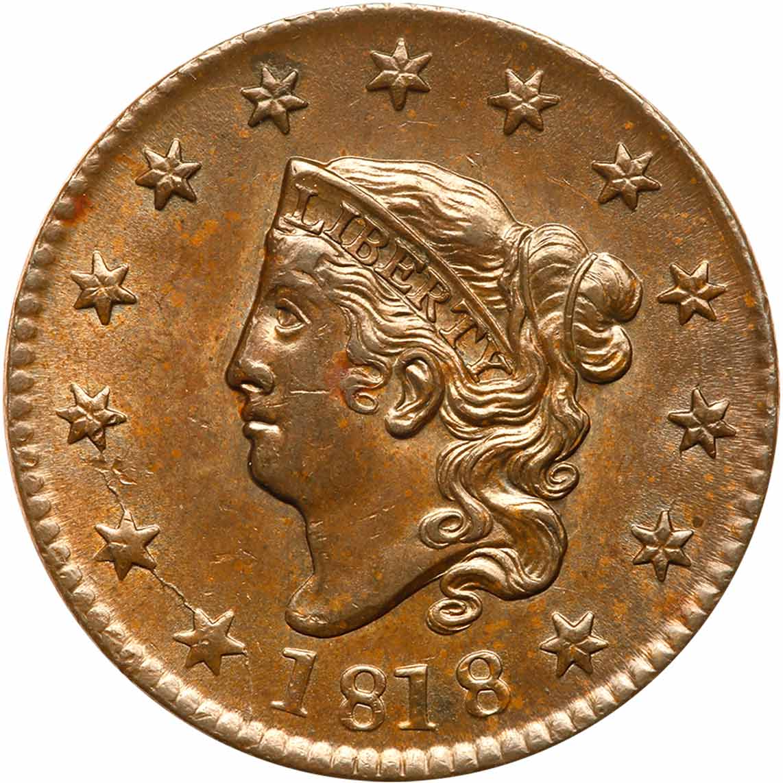 1818 N-5 R3 AU55. Choice glossy medium brown and light chocolate with a couple peeps of very faded mint red showing on the reverse. Mint frost shows in the fields and protected areas. Looks mint state but there is a touch of friction on the highest points of the devices. The only marks are a small spot of reddish toning at the curl left of the ear, a thin horizontal nick on the cheek, and a couple ticks below star 3. M-LDS. The die crack at star 1 extends down to the dentils below and most of the dentils on the obverse are still visible. Tied with one other example for finest known honors. Estimated Value $1,500 - UP