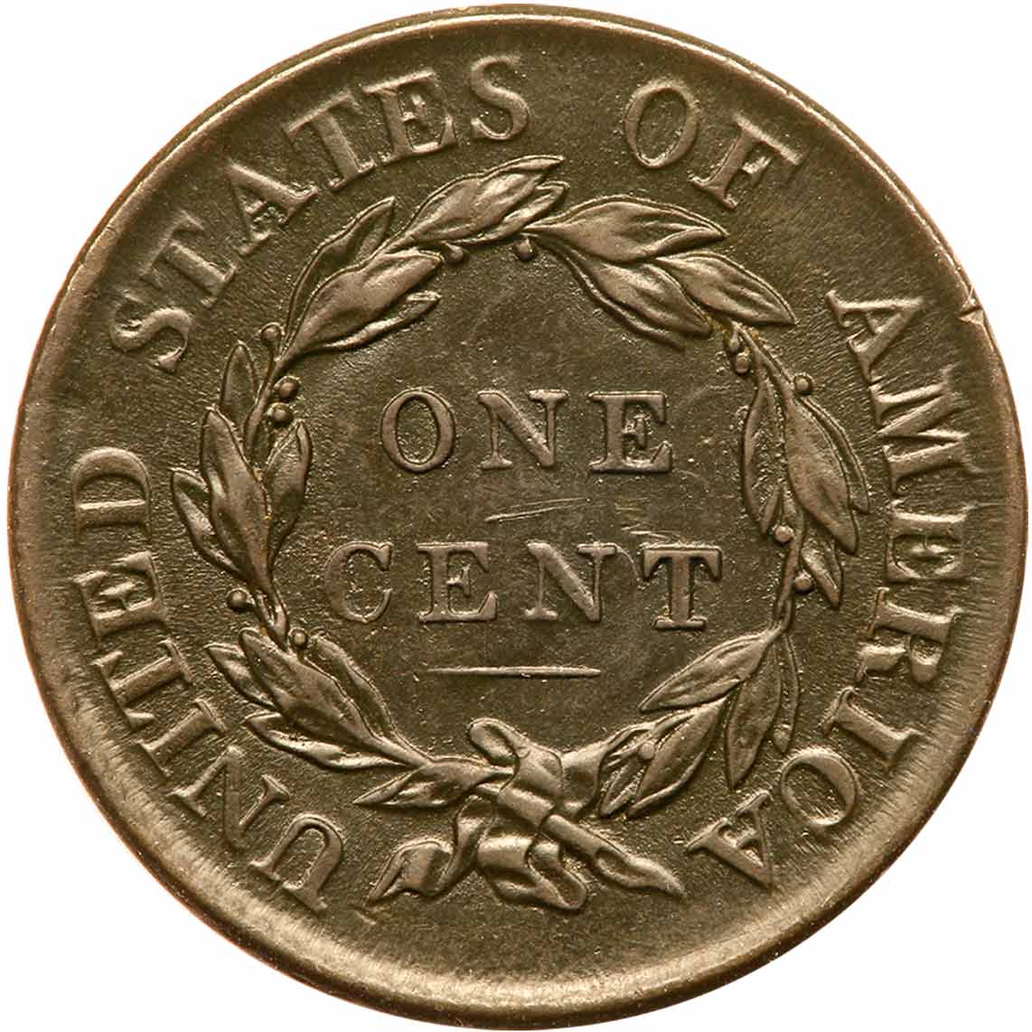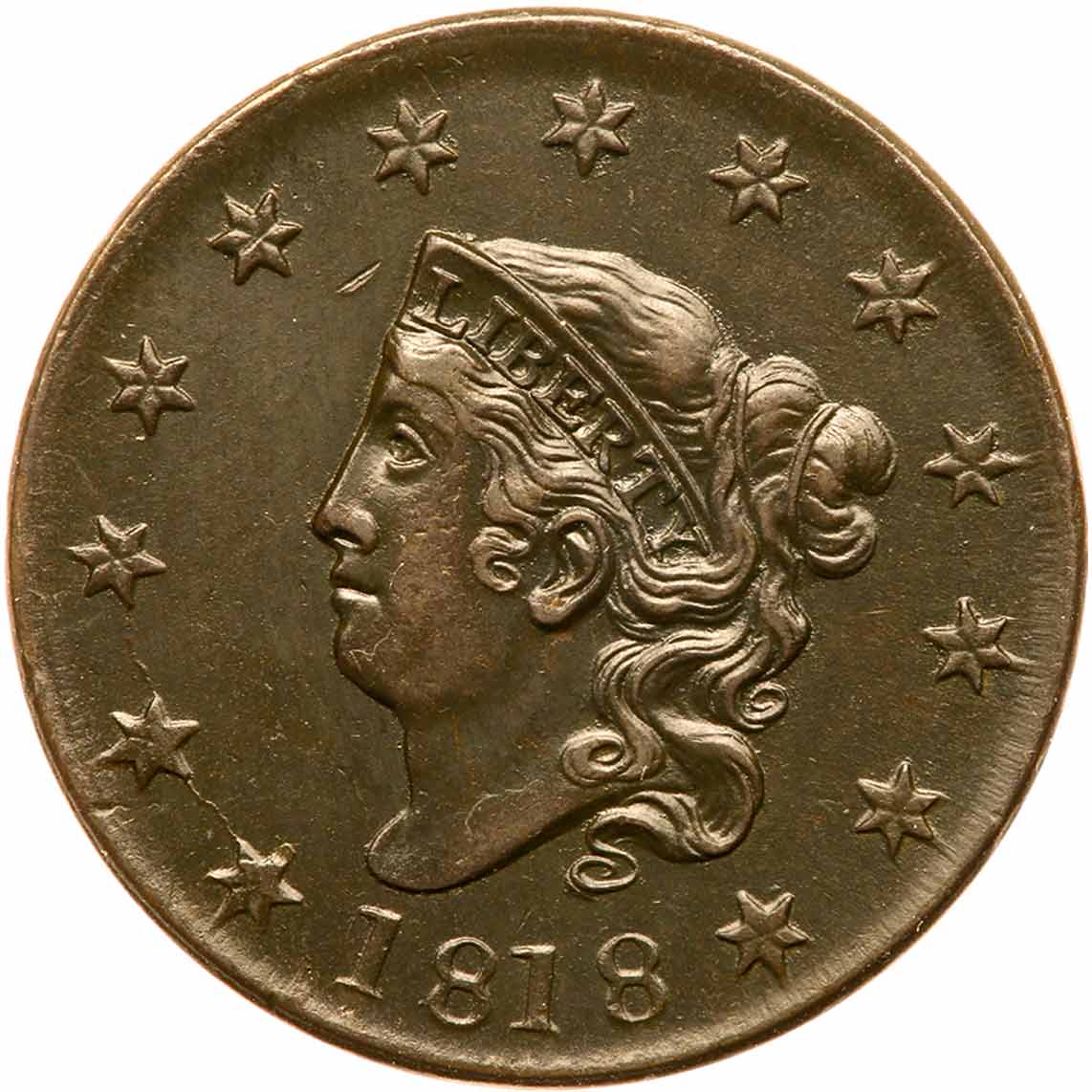 1818 N-5 R3 EF45. Glossy olive brown and steel. The surfaces are satiny and this cent has excellent eye appeal in spite of the darker than normal toning. Just a few trivial marks including a small nick between the coronet and star 5 and a tiny rim nick over the first A in AMERICA. LDS. The die crack through the first three stars reaches down to the dentils below star 1, and the dentils on both sides are gone. The latest state seen for this variety. At the lower end of the condition census for a variety that is unknown in mint state by EAC standards. Estimated Value $500 - UP