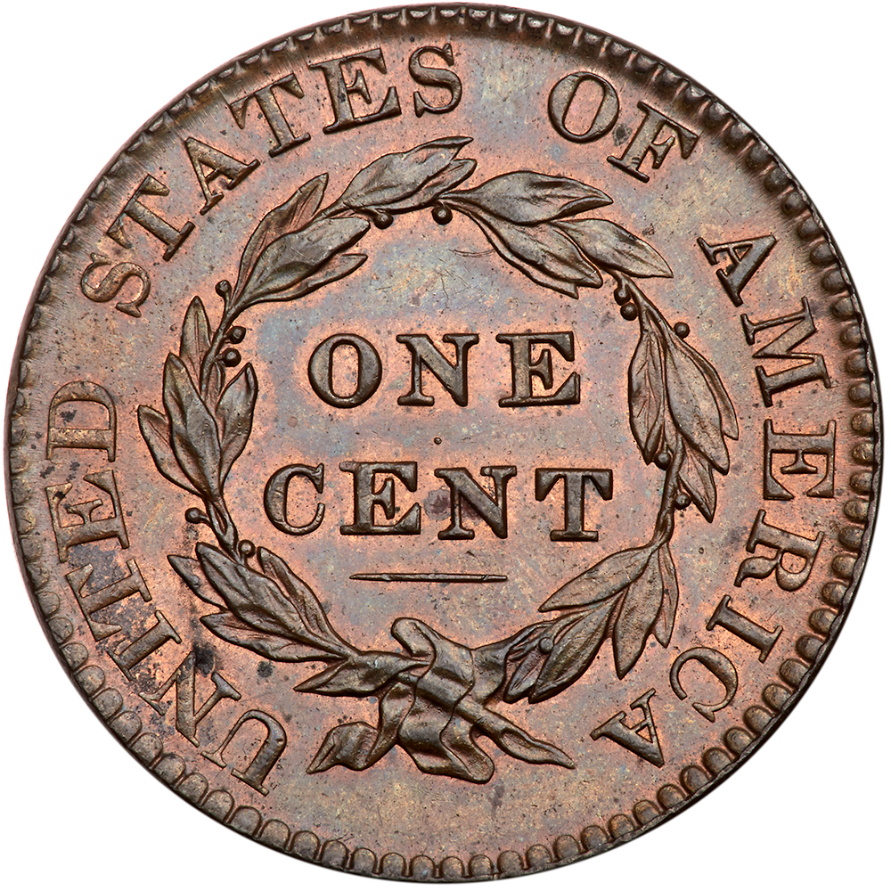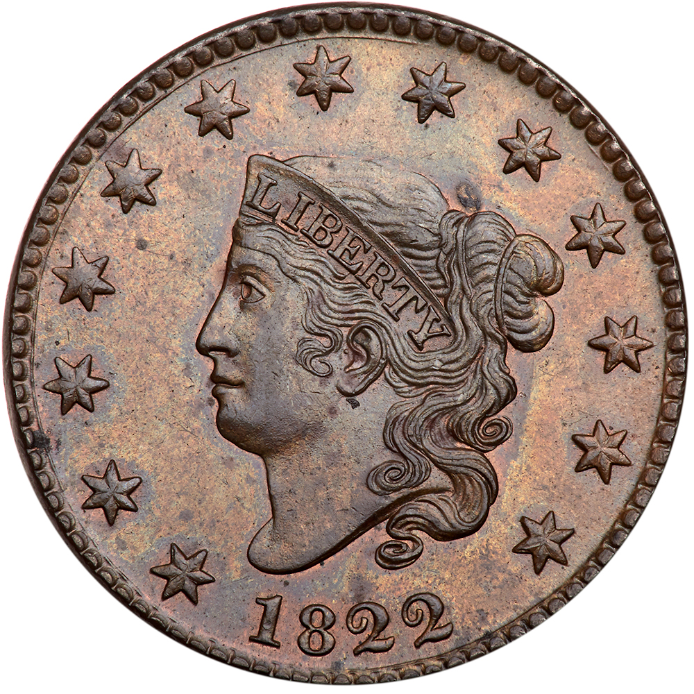 1822 N-4 R2 PCGS graded MS64 Brown, CAC Approved. Lustrous golden tan and light olive brown with faint peeps of faded mint red on the obverse and at least 5% of the reverse showing brighter mint color. The surfaces are smooth and this cent offers excellent eye appeal. The only notable marks are a spot of dark crud in the field just over the inner hair bun, a swipe of darker toning at NITE, and a spot of crud at the right bottom of that N. Nicely struck E-MDS. The obverse is uncracked and the inner circle near the dentil tips is clear from below the date to star 8 with another segment between stars 9 & 10. Graded MS60+ and tied for CC#3 in the Bland census. Noyes says MS60 net AU55, his photo #35604. Our grade is MS60. The attribution and Clapp-Ahumada provenance are noted on the PCGS label. PCGS population 1; 4 finer, 1 in 64+, 3 in 65 for the variety. PCGS #36721. Estimate Value $3,000 - UP