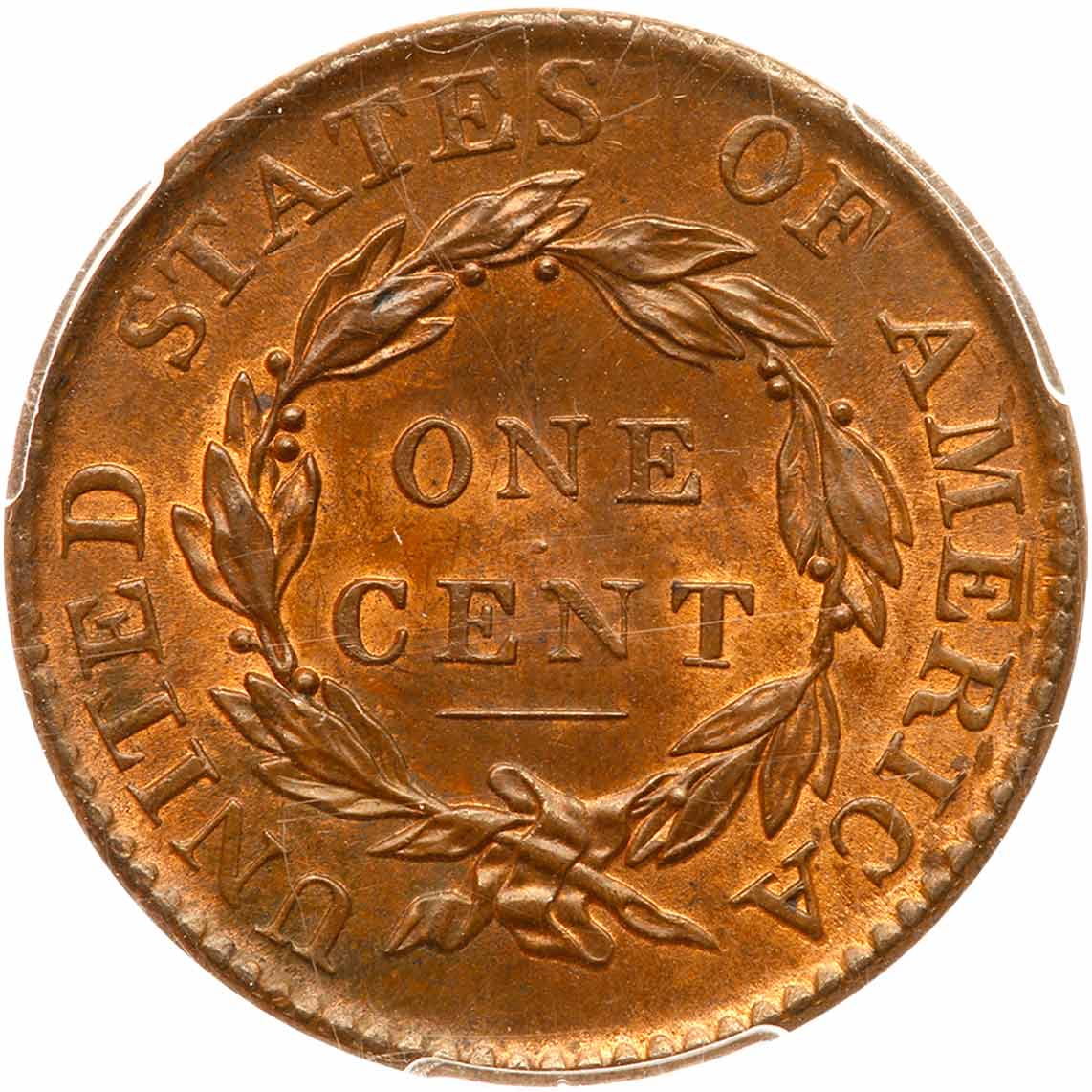 1818 N-7 R1 PCGS graded MS64 Red & Brown. Lustrous medium steel brown and light chocolate with mint red covering at least 25% of the planchet, mostly on the reverse. Essentially a flawless cent if not for a trio of small spots of slightly darker toning. Two of those spots are in the field before the nose and the third is touching the truncation over the 81 in the date. M-LDS. In addition to the always-present crack that joins stars 6 & 7 there is an additional die crack off the lower right point of star 1 and minor crumbling in the dentils at star 5. Our grade is MS63. The attribution and Ahumada provenance are noted on the PCGS label. PCGS population 1; the only RB of the variety. PCGS #36620. Estimated Value $1,250 - UP