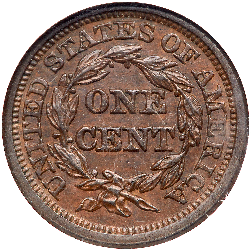 1844 N-1 R1 Repunched 1 NGC graded MS63 Brown. Frosty steel brown and chocolate with lighter brown and tan toning in protected areas. No spots or stains. This cent offers mint state eye appeal but there is a hint of rub on the highest points of the devices. The only marks are a tiny pinprick in the middle of the jawline and another on the front edge of the neck. M-LDS, die state d. Narrow rim cuds show under the 1 and the repunching at the base of that 1 is still clear. Our grade is AU55. Estimate Value $600 - UP