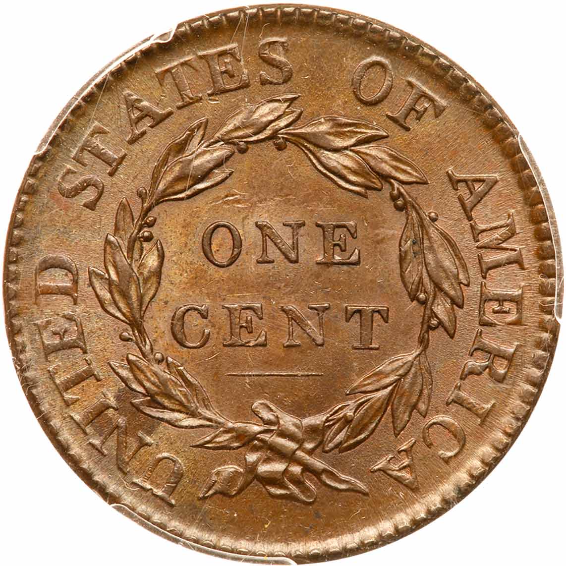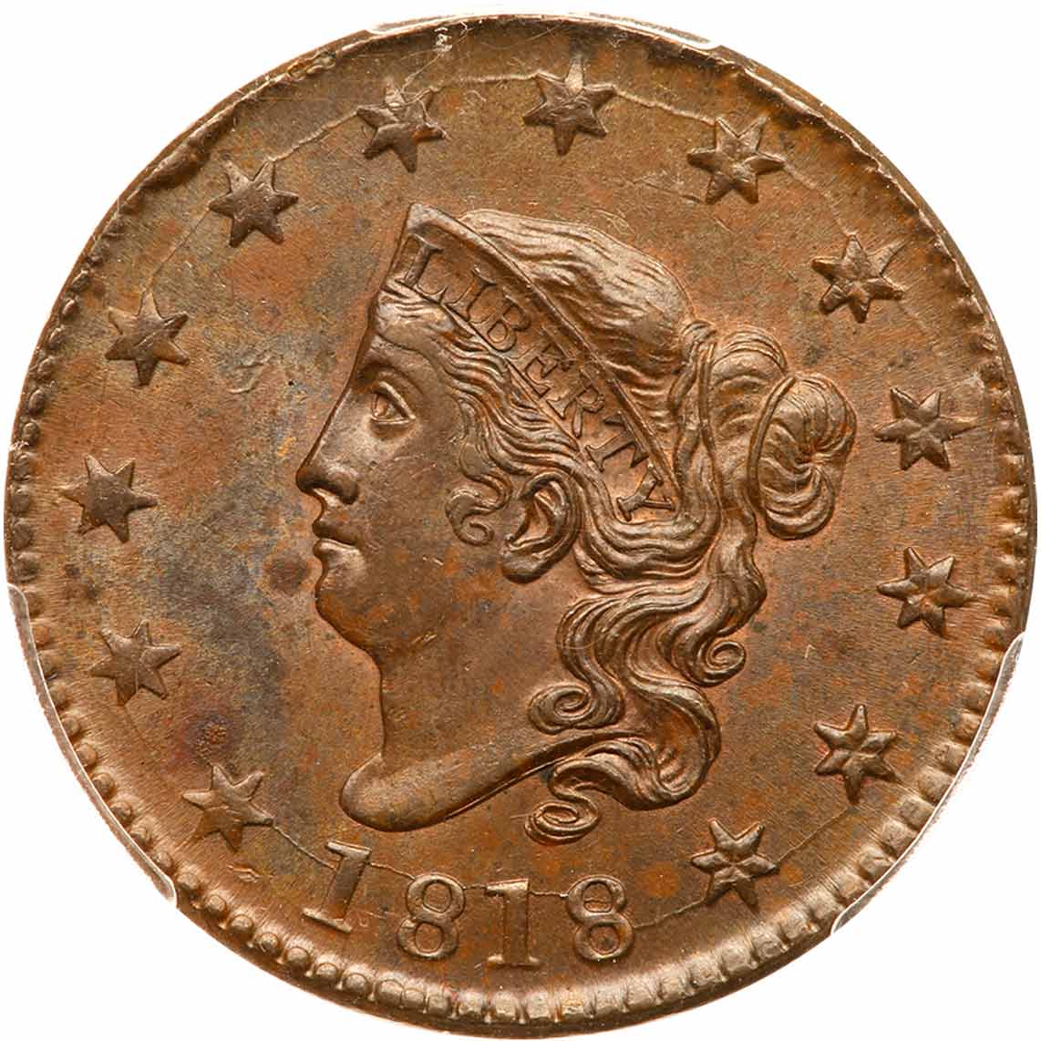 1818 N-8 R3 PCGS graded MS63 Brown. Lustrous bluish steel brown and light chocolate with a few tiny peeps of faded mint red remaining visible on both sides. Satiny mint frost covers this cent and the eye appeal is excellent. There are overtones of darker steel toning on the obverse and a splash of chocolate toning at NI in UNITED, plus a small spot of shallow reddish brown verdigris in the field over star 2 and a light contact mark in the field right of star 4. LDS with a series of small rim cud breaks at stars 5-8, the breaks extending down inside the dentils at stars 5 & 8. A very nice example of this tough die variety. Called MS62 and CC#1 in the Noyes census, his photo #20814. Bland says MS60+ and CC#1. Only two are known in mint state by EAC grading standards. Our grade is MS60+. Another great cent in this remarkable collection, and it comes with a very nice provenance. The attribution and Naftzger-Ahumada provenance are noted on the PCGS label. PCGS population 2; 2 finer, 1 in 63+, 1 in 64 for the variety. PCGS #36622. Estimated Value $2,000 - UP