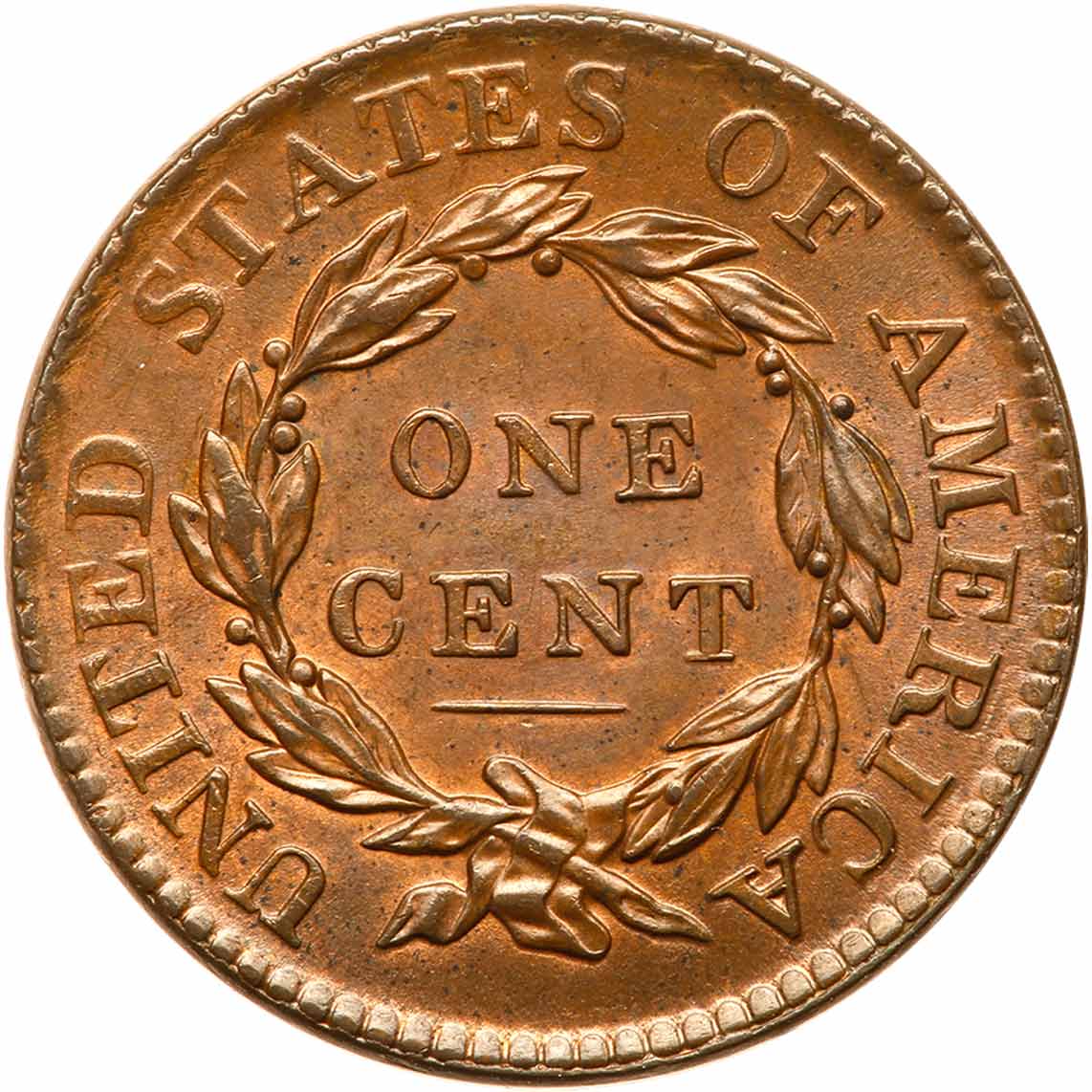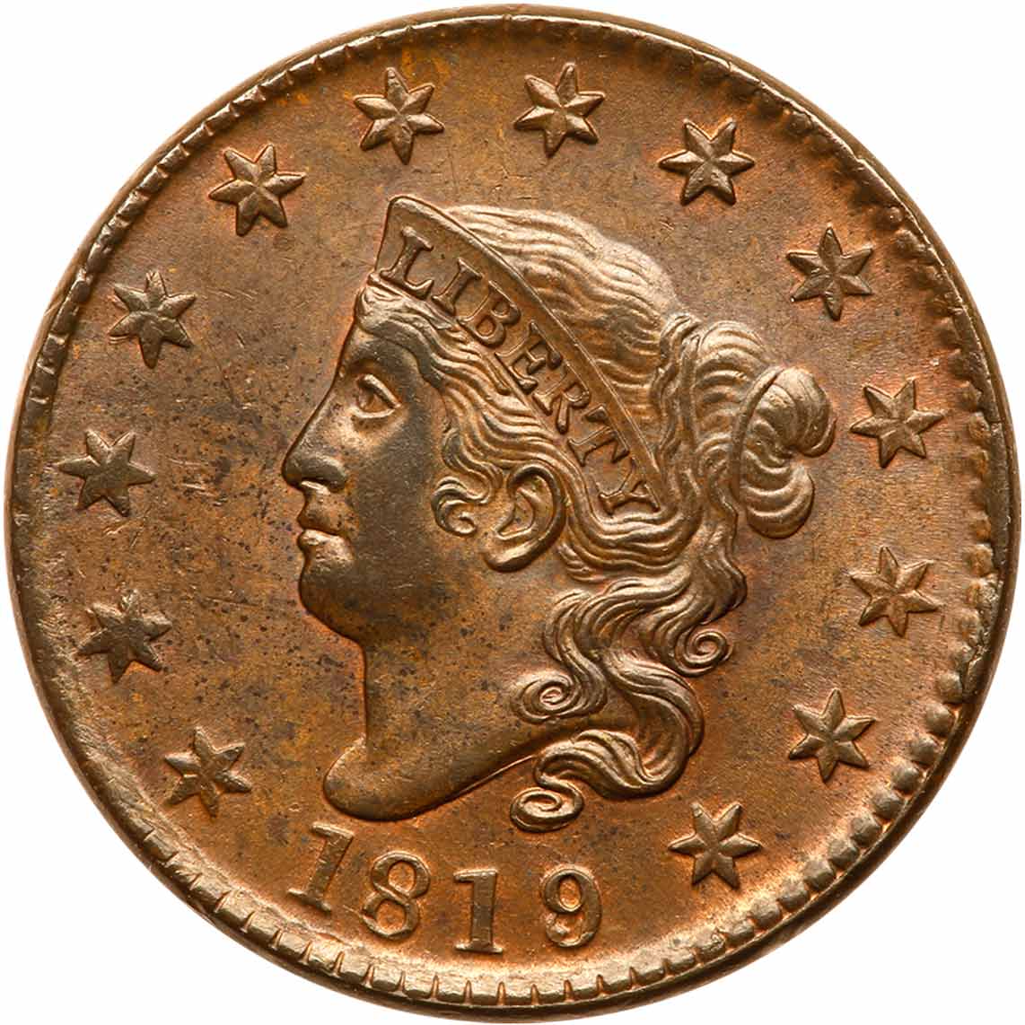 1819/8 N-1 R1 Overdate 9 over 8 MS60+. Very attractive lustrous light olive and steel brown with about 10% of the planchet showing mellowed mint red, mostly on the reverse. The only notable marks, and they are barely visible, are a couple small ticks on the lower part of the 8. LDS with narrow but clearly visible rim cuds from star 8 to beyond star 11. Removed from a PCGS holder graded MS62BN (PCGS label #1612.62/18675584 included). Estimated Value $2,000 - UP