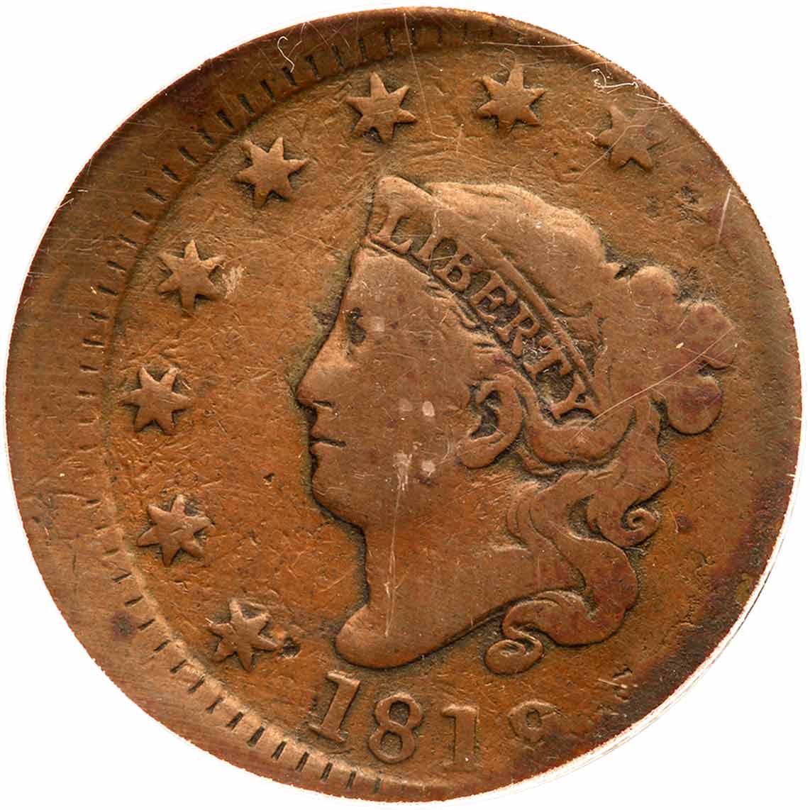 1819/8 N-1 R1 Overdate 9 over 8 PCGS graded VG10. Glossy medium brown and chocolate with traces of reddish chocolate toning on the right edge of the obverse. The surfaces are smooth, free from any significant marks. Struck 10% off center to K-3 and the reverse is rotated 30 degrees CCW from the normal head-to-foot die orientation. Our grade is VG7. The Off Center error and Dan Holmes provenance are noted on the PCGS label. Estimated Value $300 - UP Ex Ken Potter 5/10/1984-Jim Corrado, McCawley & Grellman Auctions/Goldberg’s 2/11/2007:450-Daniel W. Holmes, Jr., McCawley & Grellman Auctions/Goldbergs 9/19/2010:455-Heritage Auctions #1200, lot 2046 (includes the last lot ticket).