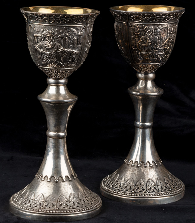 Pair of Superb, Sterling Silver Chalices with Gilt Cups, Boasting Wonderful Repousse Celtic/Fantasy/Science Designs. Outstanding pair of sterling silver chalices boasting wonderful repousse images of vaguely Celtic designs each with three vignettes of a necromancer or wizard engaing in sciences and mysticism. These are the most perfect pair of chalices for fans of cosplay, "Game of Thrones" "Lord of the Rings" or the "Avalon" series of books. Stamped R.C. Sterling and measure 11 x 5 x 5", with cup diameter 4¼ x 4 x 4" with the interiors of both cups gilt washed. In perfect condition and extremely handsome pieces. 40 troy ounces. Estimate Value $600 - UP
