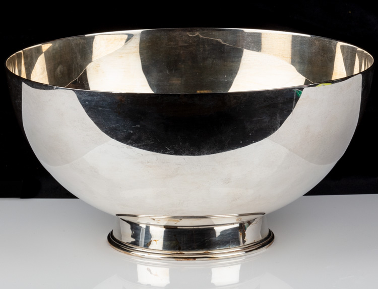 Finely Crafted Sterling Silver, Short Pedestal Bowl Originally by Cornelius Wynkoop, New York, A Reproduction of Their Bowl Introduced in 1726. Superior reproduction by Graff Washbourne Dunn of a hemispherical bowl originally made in 1726 by Cornelius Wynkoop. The Wynkoop's were a multigenerational family of early American Silversmiths and this design was most likely influenced by similar shaped Chinese porcelain export bowls popular at the time. Bowl appears to have been displayed and never used with only scattered pattern from polish. Measures 5¼ x 10 x 10" and again in excellent condition and absolutely gleams when polished. No engravings or monograms. 35 troy ounces. Estimate Value $500 - UP