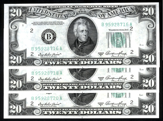Fr-2060-B. 1950-A, $20 Federal Reserve Notes. Three of them from the same pack; Fr-2060-C. 1950-A, $20 Federal Reserve Note; Fr-2060-D. 1950-A, $20 Federal Reserve Note; three Fr-2060-G. 1950-A, $20 Federal Reserve Notes; Fr-2060-J. 1950-A, $20 Federal Reserve Note; Fr-2060-L. 1950-A, $20 Federal Reserve Note. Lot of 11 notes. Choice Uncirculated. Estimated Value $375 - 475
