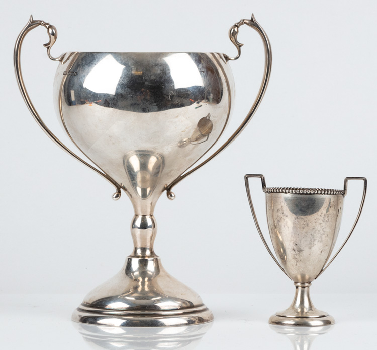 Two Antique Sterling Silver Trophy Cups. One is 6½" tall and 3½" in diameter, not including handles. With silver mark of Henry Wigfull, Sheffield with Antique trophy cups are very popular. The smaller cup is 3 1/8" high and 1 7/8" in diameter. Trophy cups are very popular now.
