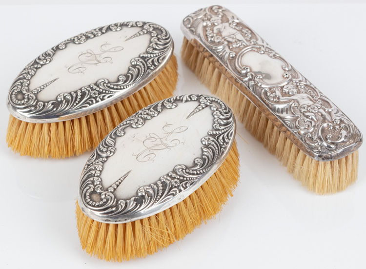 Three Antique, Sterling Silver Victorian Clothes/Hair Brushes, Very Collectible. Three highly prized and beautiful sterling silver Victorian era clothes or hair brushes. Two are a matched pair 4¾ x 2¾ with beautiful repousse details, with centered monograms L and C. The third has elaborate repousse detail with cherubs in a foliate design, center cartouche having no monogram 6½ x 1½. All three wonderful antique pieces. Estimate Value $350 - UP