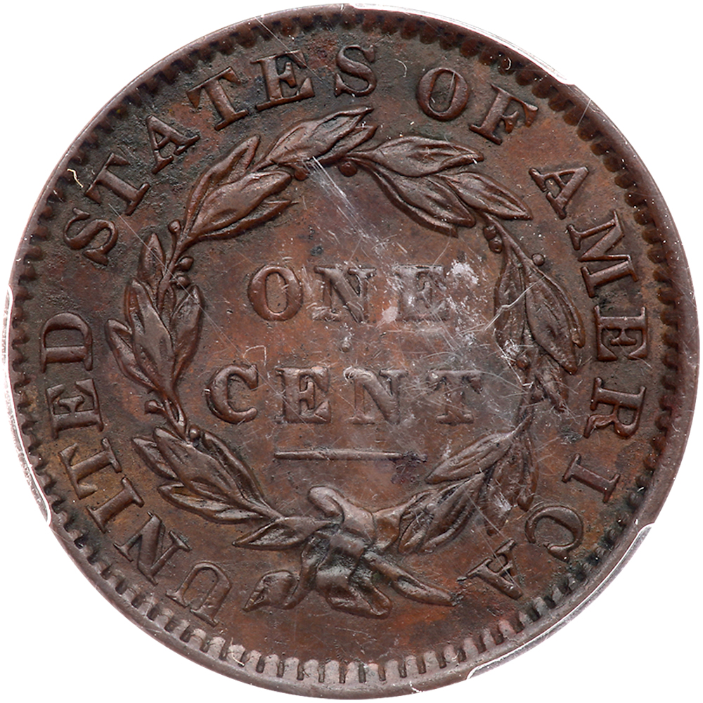 1834 N-3 R1 Large 8, Small Stars PCGS graded AU55, CAC Approved. Glossy light chocolate brown mixed with some darker olive brown toning, especially on the reverse. Traces of frosty mint luster are visible on both sides, but there is quite a bit of shallow dirt in protected areas. The only notable mark is a shallow dent on the edge over the E in AMERICA. MDS with a fine die crack through stars 12 & 13 to the dentils on both ends. Our grade is EF40+.