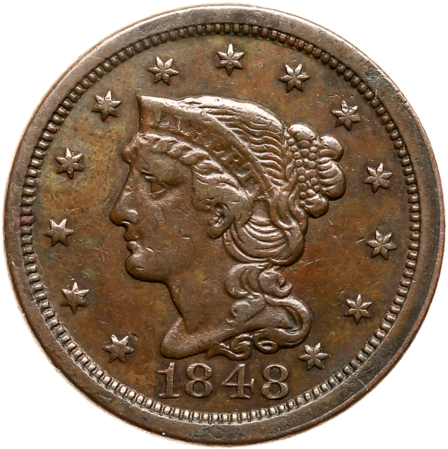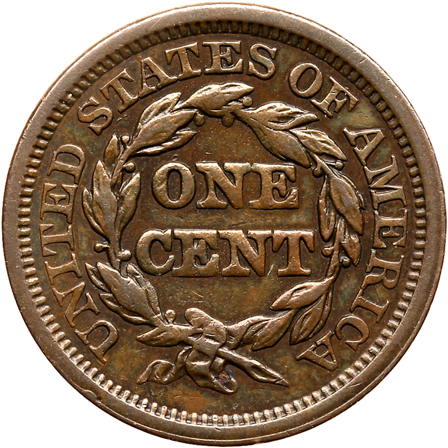 1848 N-32 R5 VF20. Glossy light olive and chocolate brown. The surfaces are smooth and attractive, but there are traces of extremely faint roughness in a few places on the obverse rim. No verdigris, only a few minor contact marks. A tiny planchet chip off the upper right point of star 1 (as struck) can help identify this cent. EDS. The die cracks on the reverse are present but light and fine parallel die lines show from the dentils at stars 11-13. A nice example of this tough die variety. Tied for CC#5 honors in the Grellman census. Estimate Value $300 - UP