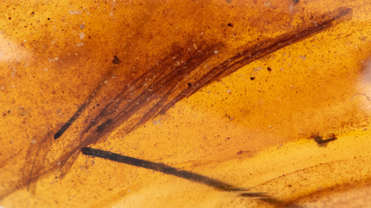 Thin Dinosaur Feathers in 100 Million Year Old Burmite Amber. Most amber is too young to have dinosaur feathers in, but Burmite is the name for 100 million year old amber found in the Hukawang Valley in northern Burma (Myanmar). These feathers could belong to an early bird or theropod dinosaur because what defines a dinosaur and an early bird is somewhat blurred. Both Coelurosaurs and Tyrannosaurs are known to have been feathered from remarkable fossils found in China. These 8mm long thin feathers are exceptionally clear and beautifully preserved in a 17 x 10 x 3 mm polished cabochon of honey colored amber. The thin feathers have excellent detail and are symmetric which means that they are not a flight feathers but rather most likely head or neck feathers which also add to the probability that they are indeed dinosaur feathers.