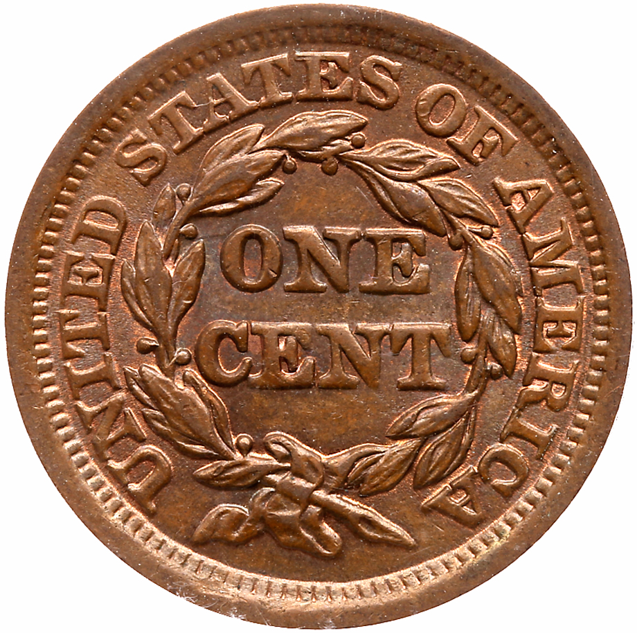 1854 N-9 R2 PCGS graded MS63 Brown. Frosty medium steel brown and light olive with a subtle hint of light bluish steel overtone. About 5% of the original mint red remains visible on both sides and this cent offers excellent eye appeal. No spots, stains, or significant contact marks, but there is a hint of rub on the highest points of the devices. A microscopic pinprick under the lowest point of star 12 and a tiny tick on the lower right part of the O in ONE can help identify this cent, but they are barely visible with a glass. M-LDS, die state c, with die clashmarks on both sides and a fine flowline from the left end of the base of the 1 to the space between two dentils. The stray 1 punched into the right side of the ear and the top of an 8 in the space right of the Y in LIBERTY are both easily visible (the so-called "Dartboard Obverse" variety). Our grade is AU58. Estimate Value $300 - UP